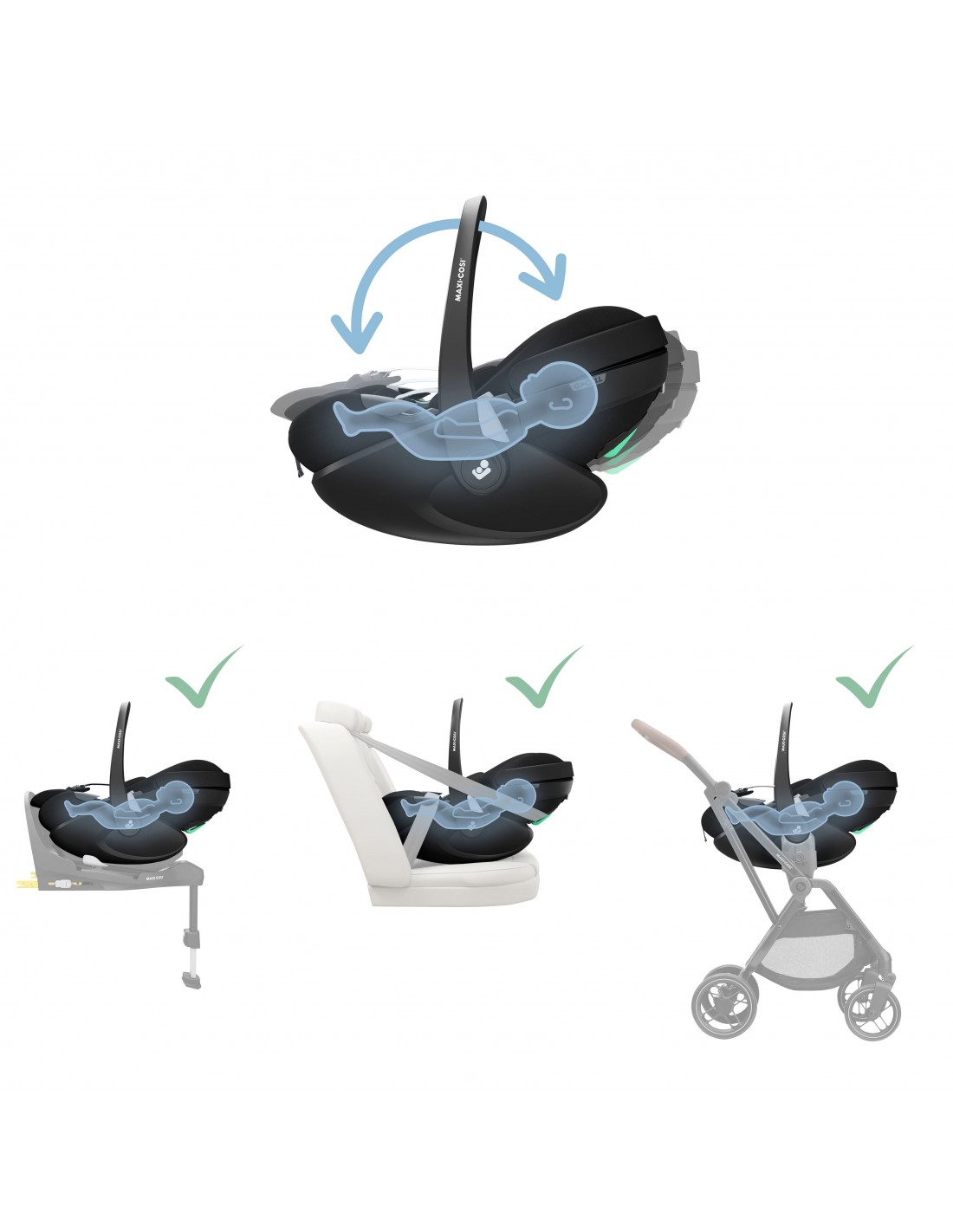 Maxi-Cosi Pebble 360 Pro is designed to make parents’ lives easier every day. When used with the rotating FamilyFix 360 Pro slide out base (sold separately), you can effortlessly rotate and slide your child toward you. No backache, head bangs or struggles; simply lock, slide, spin and go! ISOFIX connectors and support leg on the base provide the safest, easiest way to install the car seat, while helpful visual indicators show when the base and seat are properly installed, giving you the reassurance you want as a parent. With the slide out base, Pebble 360 Pro can be rotated smoothly and easily in any recline position. The easy-in harness stays open and out of the way, allowing you to fasten your baby in the seat with minimum fuss. Pebble 360 Pro can be safely and easily belted into any car without the base, and once outside, it easily attaches to a pushchair in one quick click. The seat’s ergonomic handle lets you carry your baby to and from your car securely and easily too.