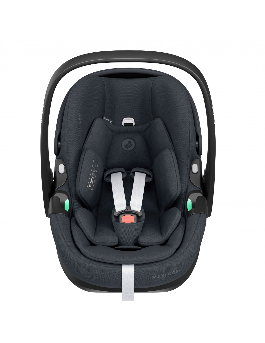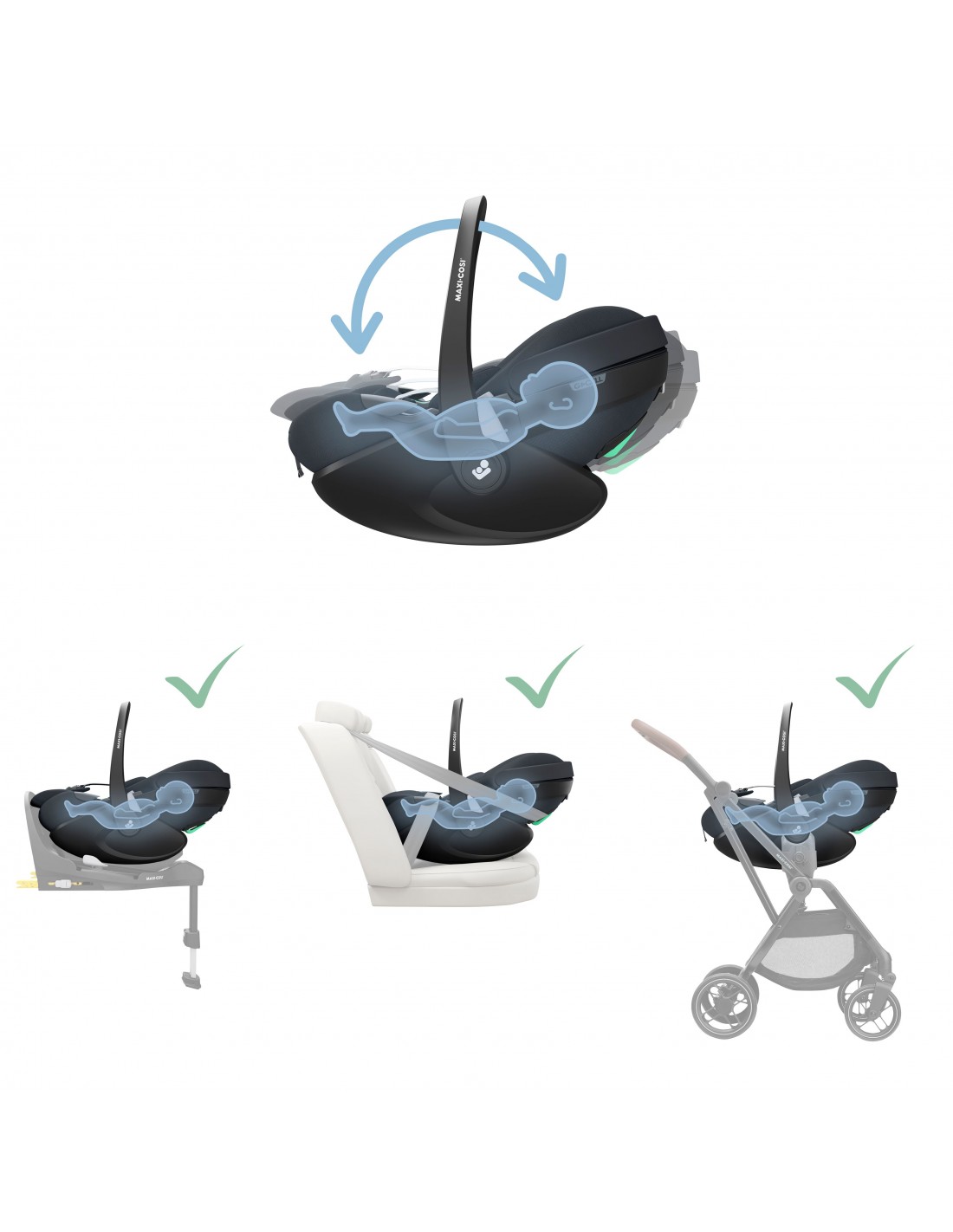 Maxi-Cosi Pebble 360 Pro is part of the 360 Pro Family range, featuring one-hand rotation and SlideTech™ – the revolutionary sliding car seat technology that makes every day easier. No backache, head bangs or struggles; simply lock, slide, spin and go! The Pebble 360 Pro delivers maximum sleep comfort for your baby, from birth to 15 months. The seat features three recline positions (including a superior full lie-flat position) which can be used in the car and attached on a pushchair. The lie-flat position offers a more natural sleeping position for babies, as it helps keep their airways open and allows them to breathe more easily. When used with the rotating FamilyFix 360 Pro slide out base (sold separately), you can effortlessly rotate and slide your child toward you. The Easy-in harness adds even more convenience, allowing you to fasten your baby in with minimum fuss. On the road, Maxi-Cosi’s integrated G-CELL Side Impact Protection provides superior safety.