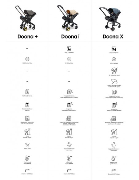 Doona X is the new generation of the Doona Car Seat & Stroller. Now with 3 recline positions, Doona X allows your child to lie down and relax. With its integrated, adjustable harness and headrest, the Doona X meets the European i-Size safety regulation (R-129). The patented shock absorbers and smooth-release system offer a smoother and safer ride than ever. The Doona X comes with the Doona SIP add-on, providing enhanced side-impact protection.