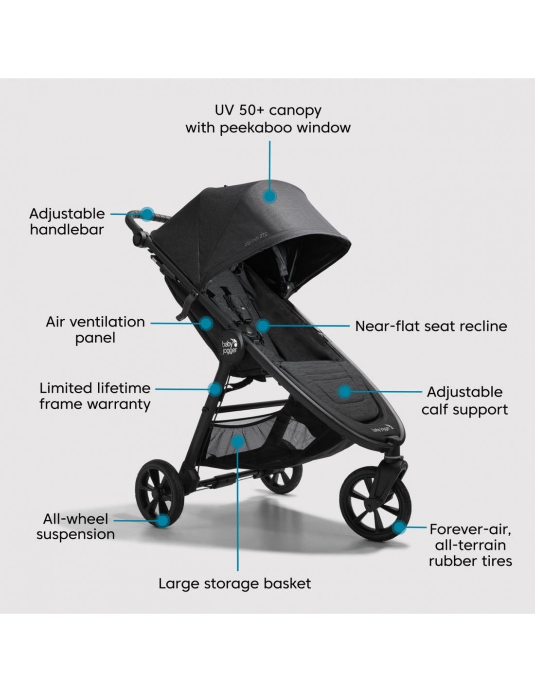 The Baby Jogger® City Mini® GT2 has an all-new design with forever air rubber tyres and all-wheel suspension providing uncompromised agility on any terrain. The signature one-hand compact fold, adjustable handlebar, and hand-operated parking brake provides you the ultimate convenience while the adjustable calf support and near-flat seat recline allows you to find the most comfortable position for your child.