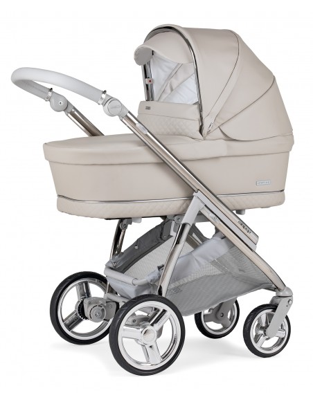 Ultra compact chassis with only 54cms wide. With four wheel suspension and wheels with ball bearings the pram can be manoeuvred with just one hand. The wheels are designed for an agile rise, they facilitate the action of going down and up stairs and absorb bumps, unevenness and irregularities on the surfaces. Easy to open and fold with seat unit attached either way. 7.5kg with basket.