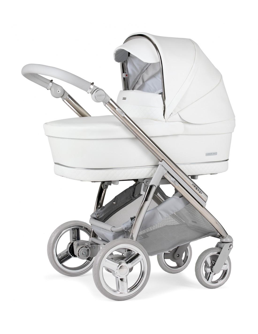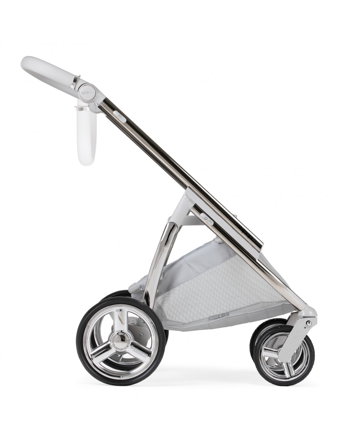 Ultra compact chassis with only 54cms wide. With four wheel suspension and wheels with ball bearings the pram can be manoeuvred with just one hand. The wheels are designed for an agile rise, they facilitate the action of going down and up stairs and absorb bumps, unevenness and irregularities on the surfaces. Easy to open and fold with seat unit attached either way. 7.5kg with basket.