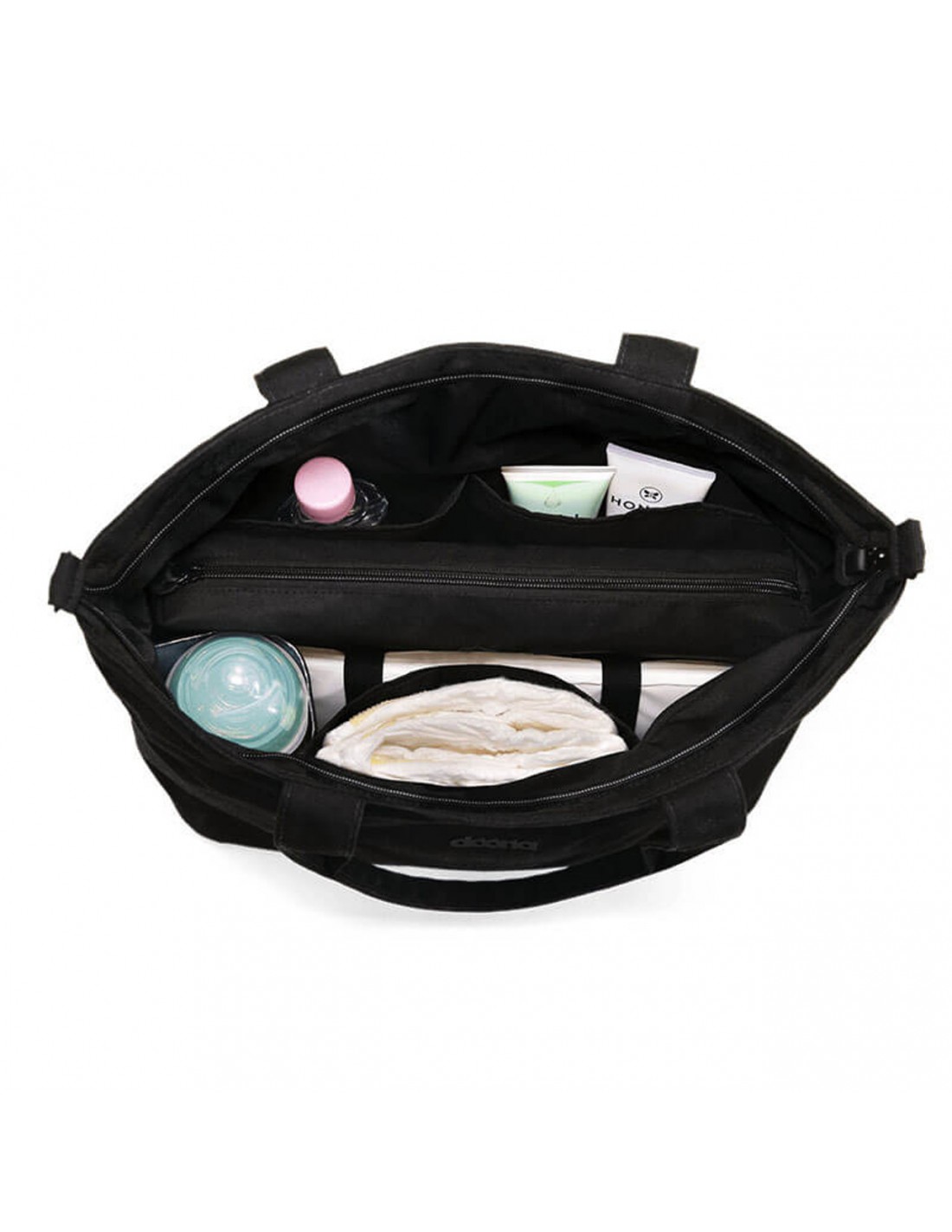 With a zippered exterior pocket, multiple interior compartments, a thermal bottle pocket, a detachable pouch insert, and a foldable changing mat, the bag carries on-the-go necessities and allows you to be hands-free all day long.