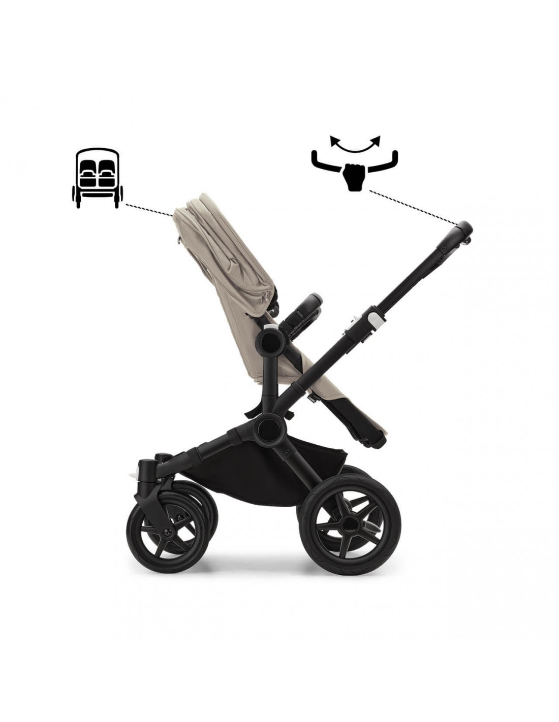Let your children roam the world side by side, at the same height. The seats can be arranged to face you, face each other or face the path ahead.