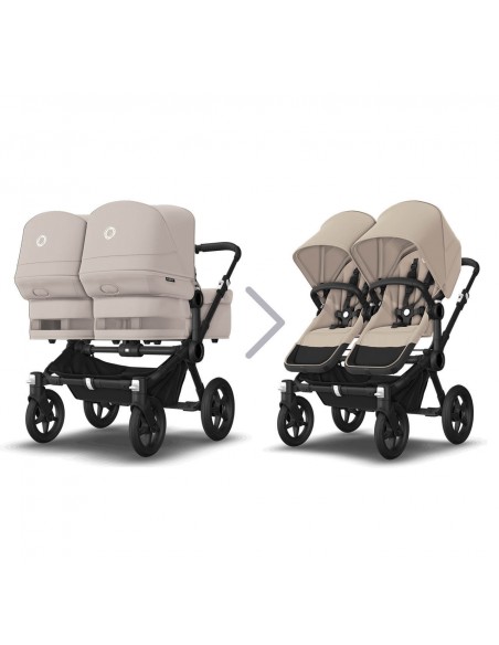 The configurations available for the Bugaboo Donkey 5 give you unrivaled flexibility. Stroll with a newborn and extra storage in Mono. Create a closer side-by-side connection, at the same height, for two babies in Twin or two siblings with an age gap in Duo.