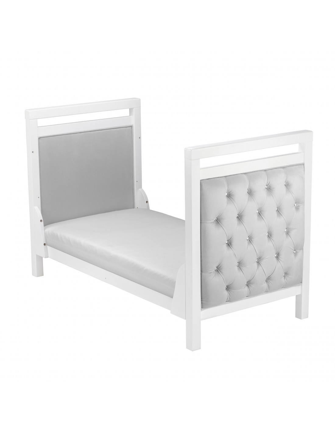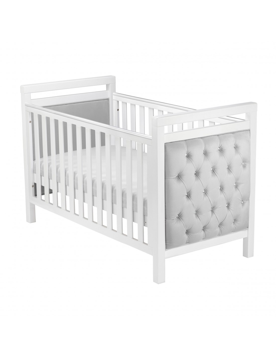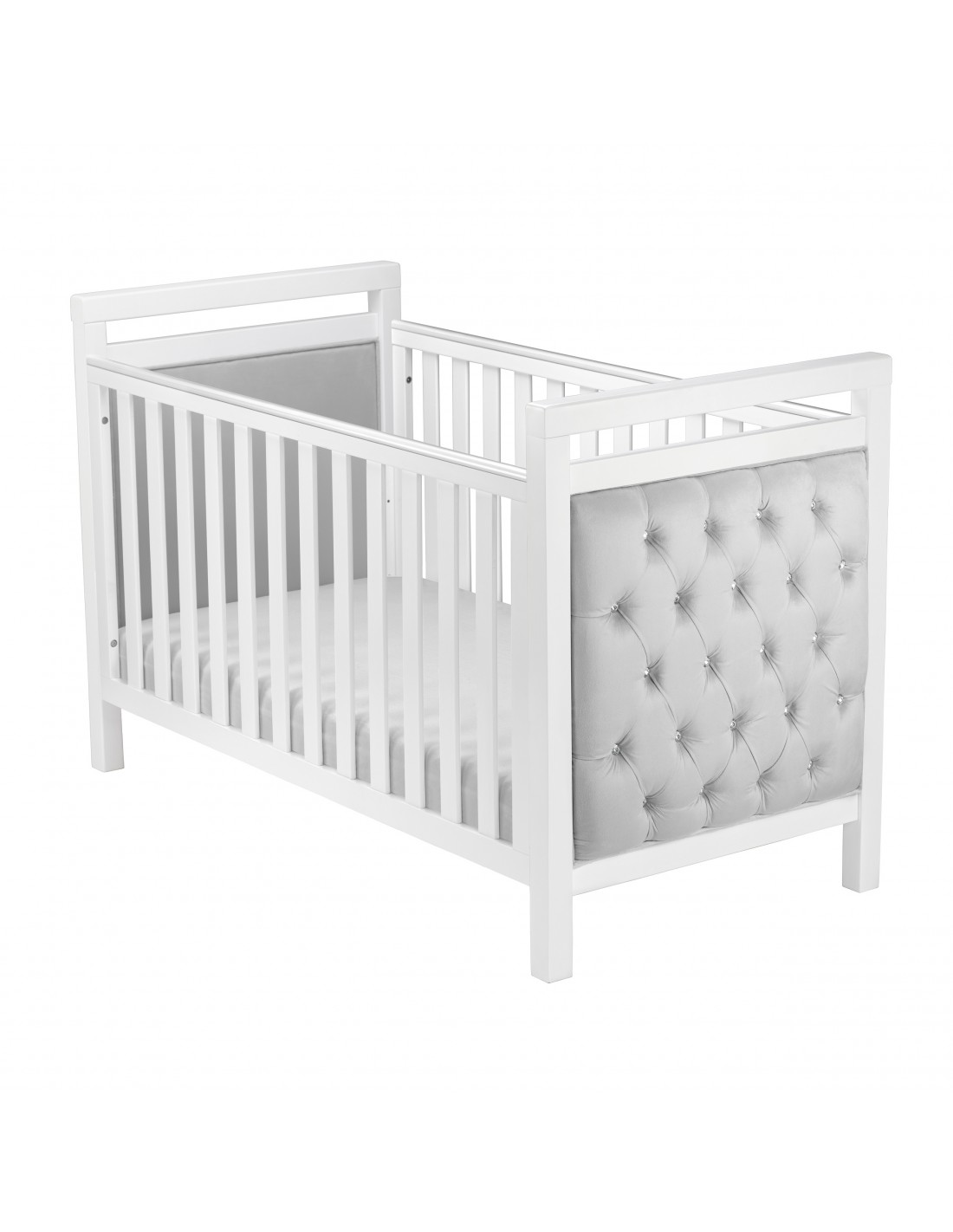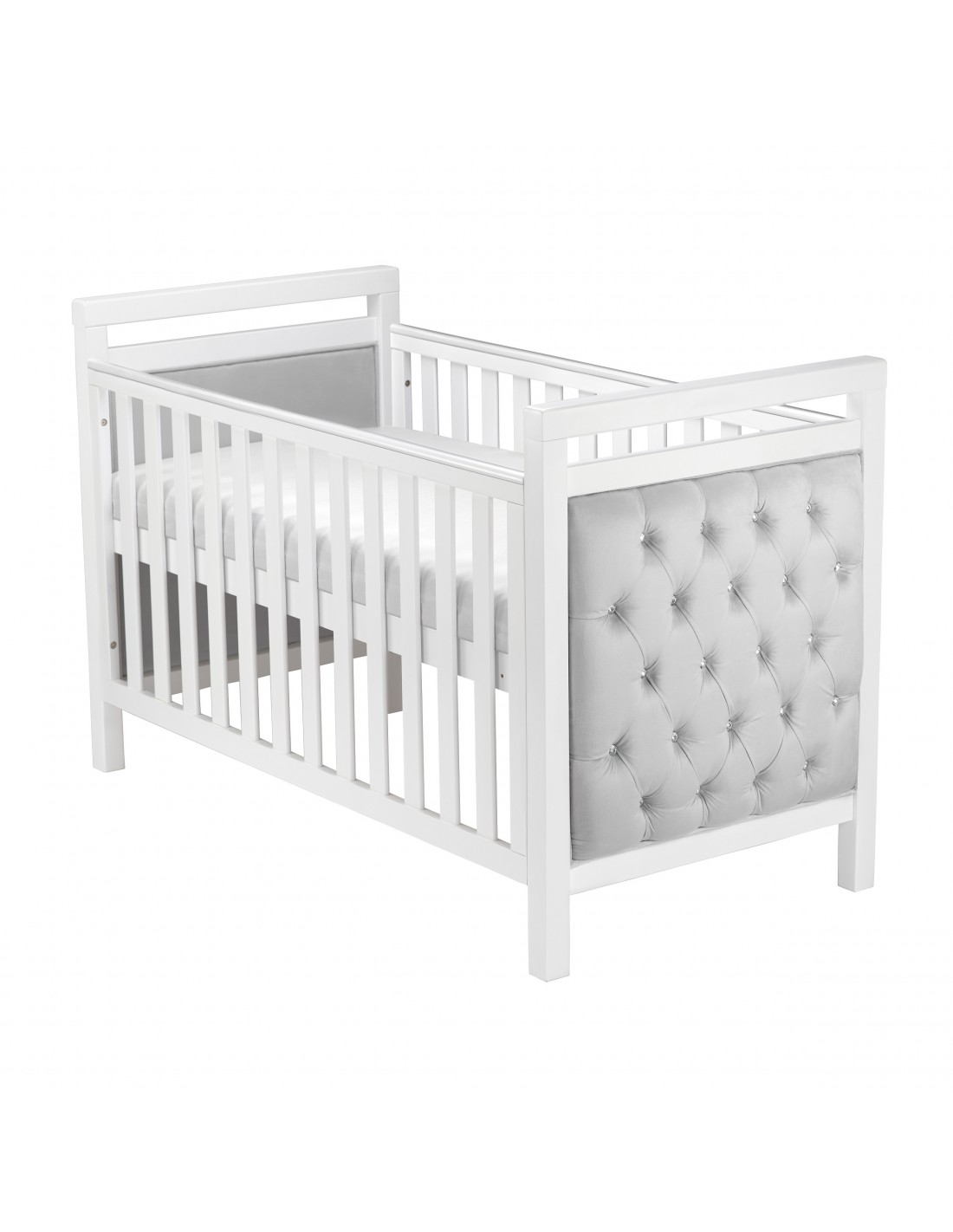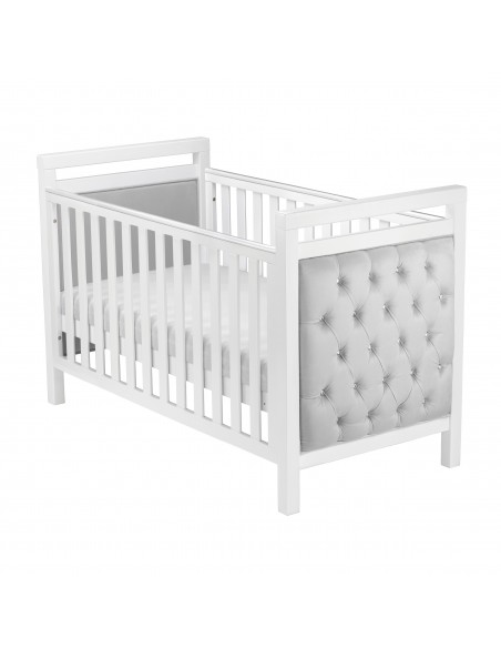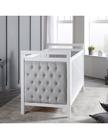 The luxurious diamante button detailing, combined with the soft velvet upholstery, give this modern cot bed a modern feel that will complement any nursery. The fabric is water resistant and durable, making keeping it clean very simple. A teething rail is installed on either side to help prevent marks in the wood from teething children.