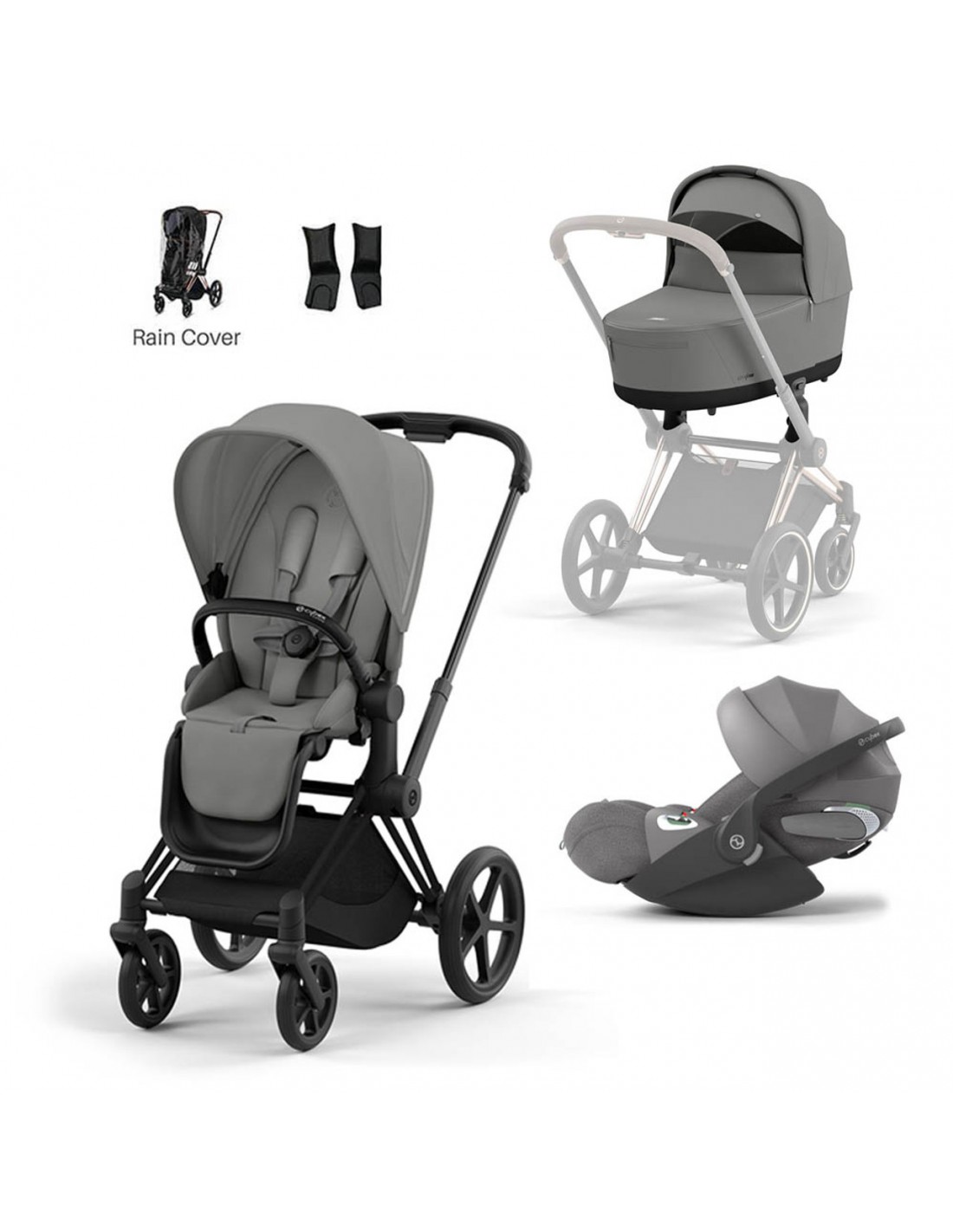 Includes; chassis with wheels, shopping basket, bumper bar, raincover, car seat adaptors, priam seat pack, priam lux carrycot, carrycot raincover, carrycot mattress & cloud t plus car seat.