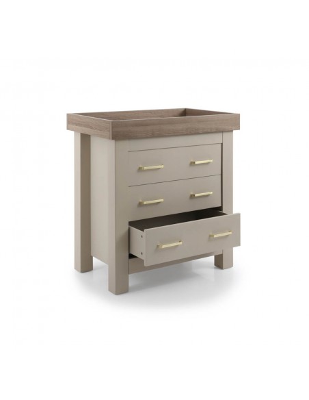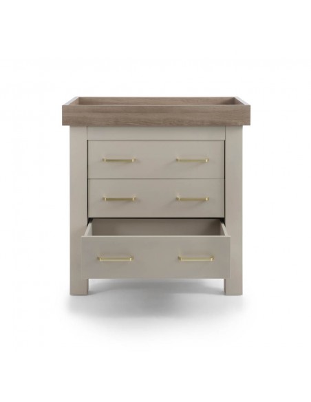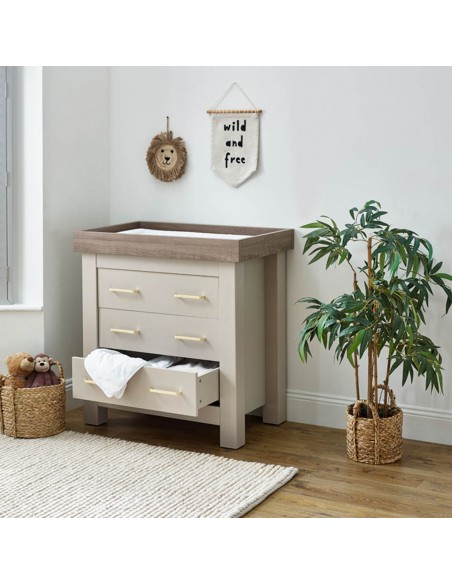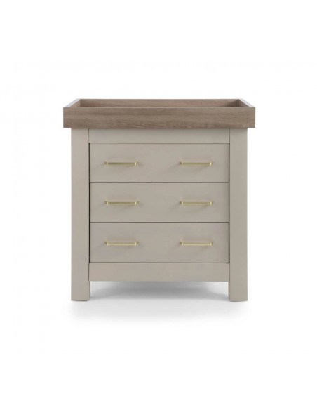 Part of the sophisticated Charnwood Collection by BabyStyle, the Bordeaux Oatmeal Dresser offers stylish utility with timeless design. Finished in a warm, textured oatmeal tone complemented by modern hardware, it fits beautifully into any nursery theme. The top features a removable changing lid with concealed fixings—perfect for effortless transformations without leaving marks. Inside, three generously sized soft-close drawers glide smoothly, providing ample storage for nappy essentials, clothes, and more. It aligns beautifully with the Bordeaux Oatmeal furniture range and stands ready to support your family's evolving needs.