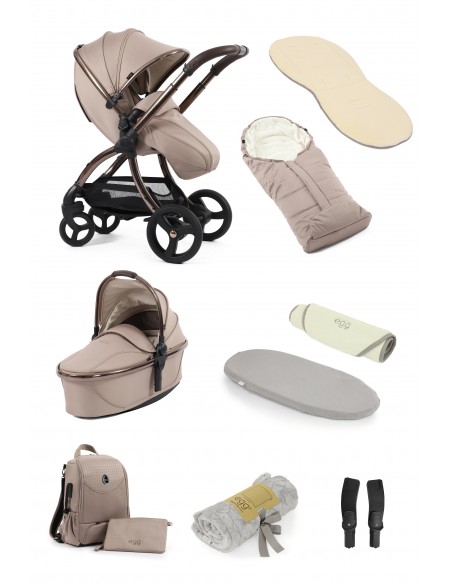 Includes; chassis, seat unit, raincover, insect net, apron, fleece liner, shopping basket, extendable canopy, carrycot with mattress, carrycot raincover, changing rucksack, footmuff, car seat adaptors, fleece blanket, x2 fitted carrycot sheets (1 grey, 1 ivory) & sherpa carrycot topper.