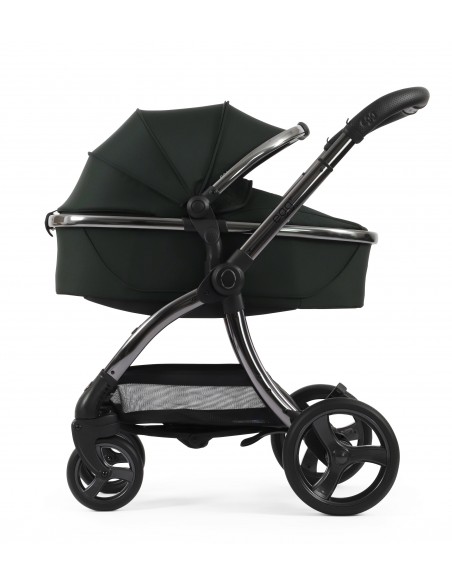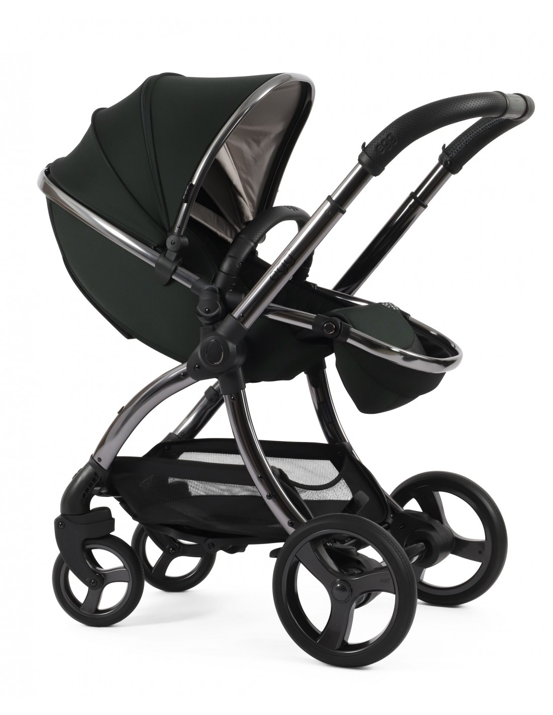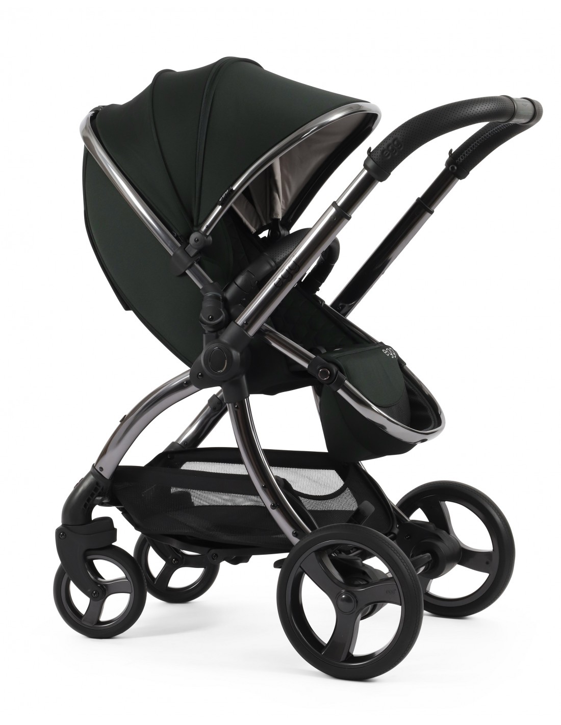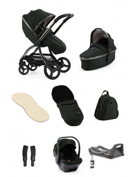 Includes; chassis, seat unit, raincover, insect net, apron, fleece liner, shopping basket, extendable canopy, carrycot with mattress, carrycot raincover, changing rucksack, footmuff, car seat adaptor, matching Egg Shell iSize car seat & Egg Shell IsoFix base.