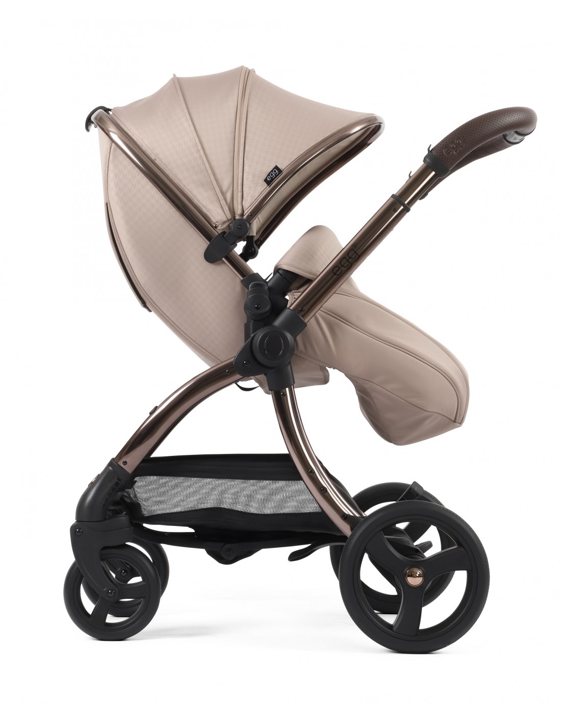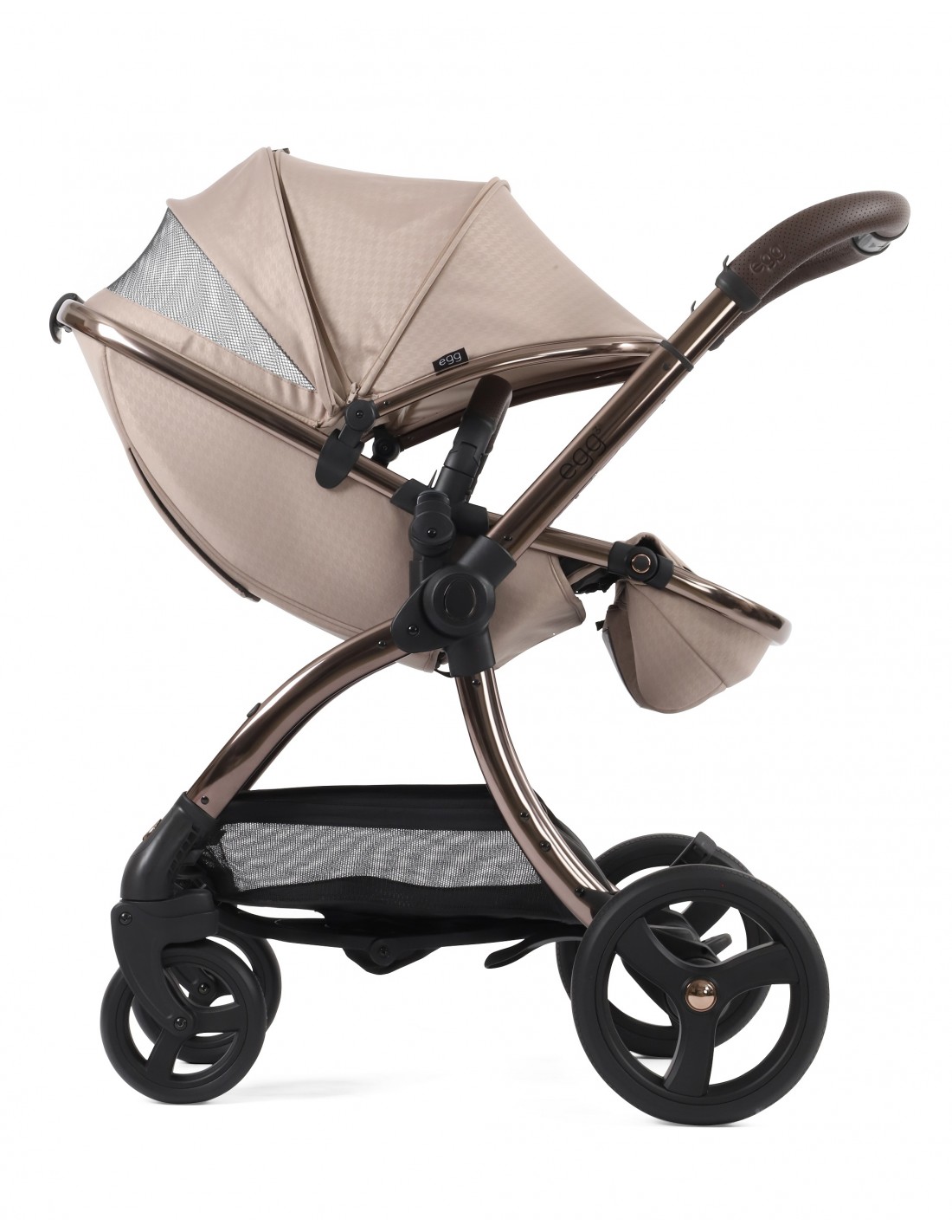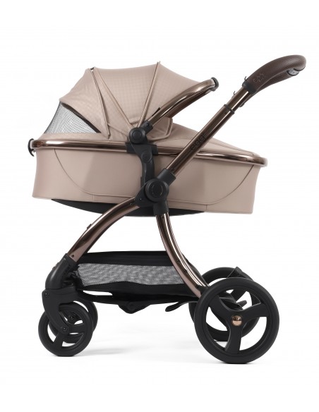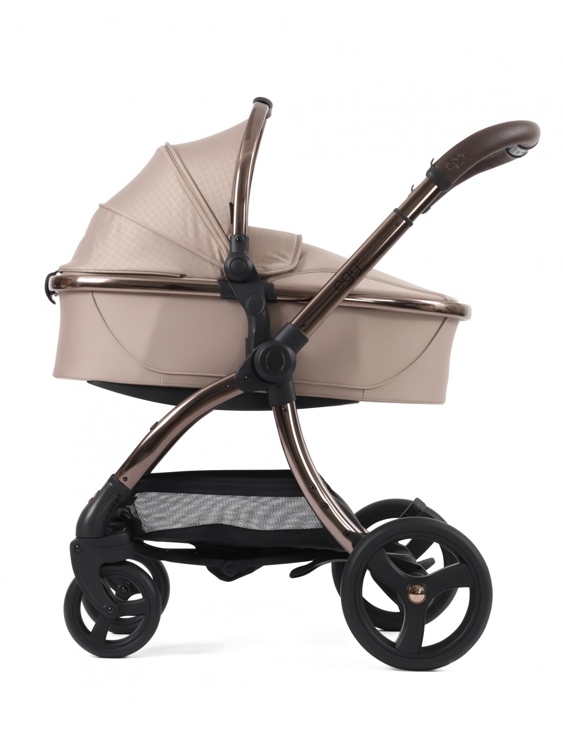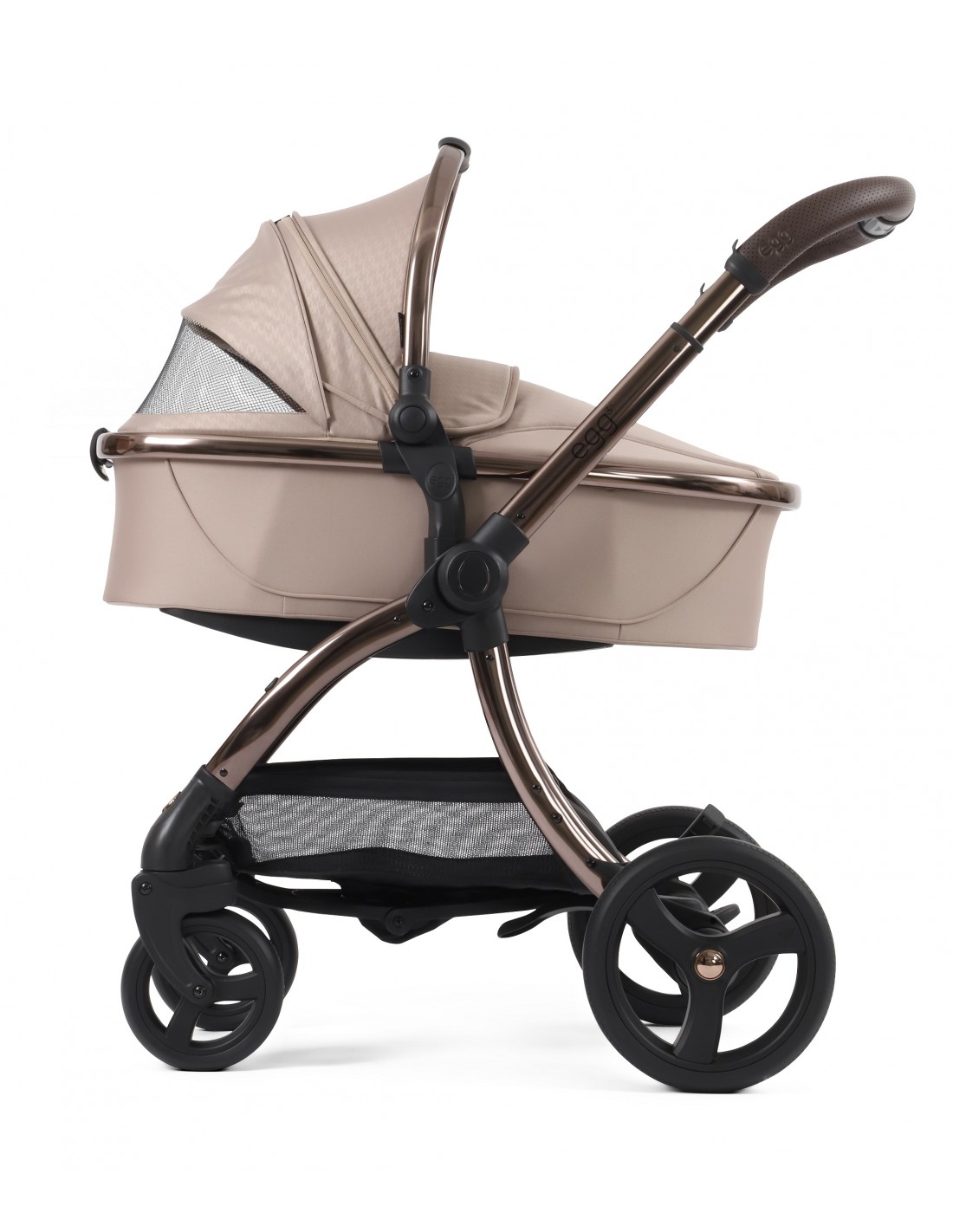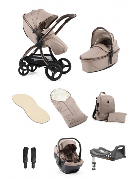 Includes; chassis, seat unit, raincover, insect net, apron, fleece liner, shopping basket, extendable canopy, carrycot with mattress, carrycot raincover, changing rucksack, footmuff, car seat adaptor, matching Egg Shell iSize car seat & Egg Shell IsoFix base.