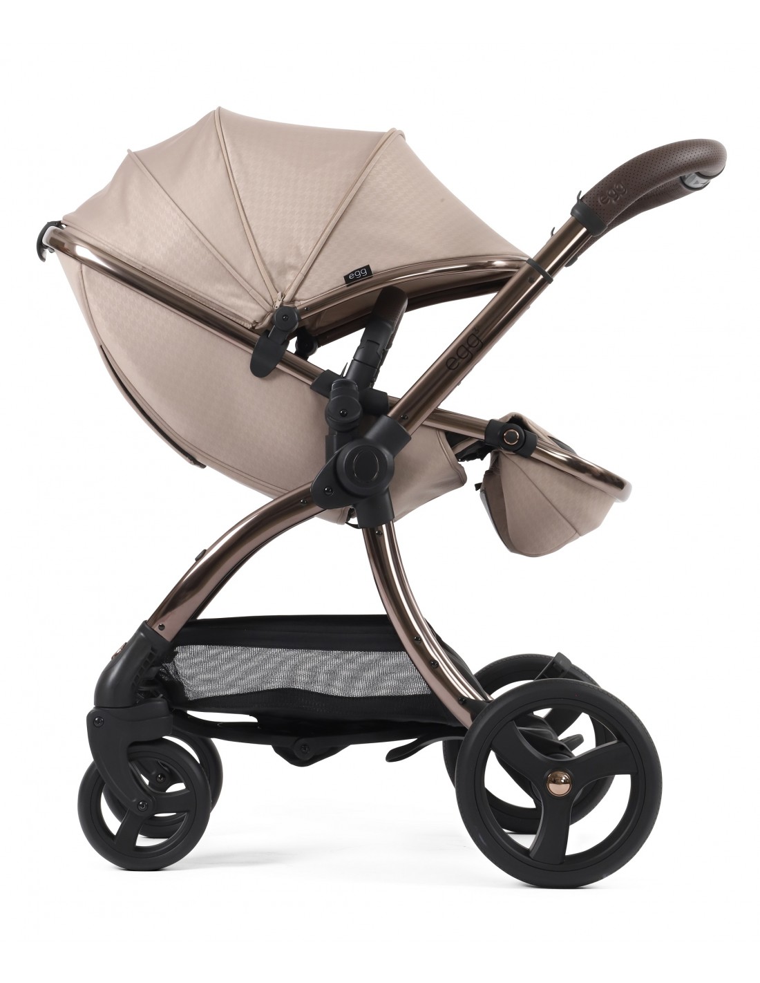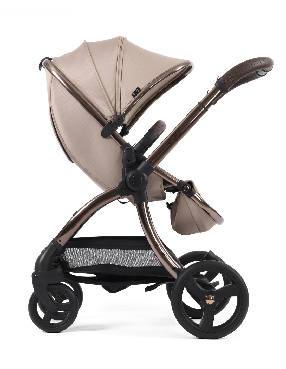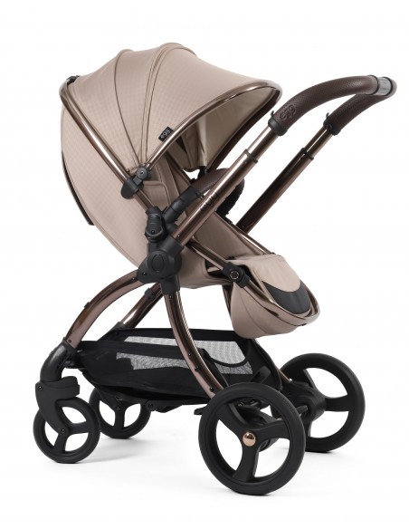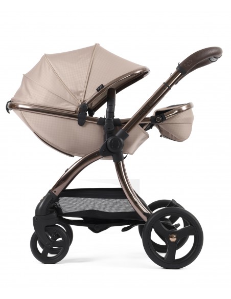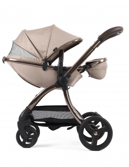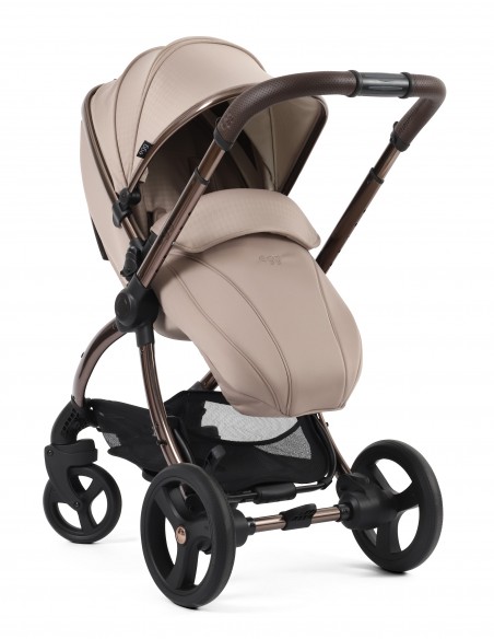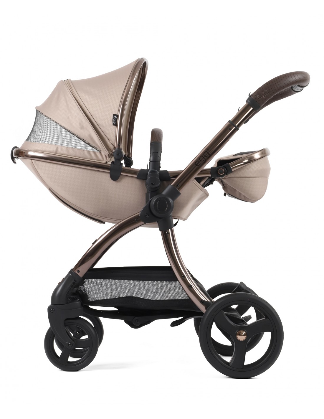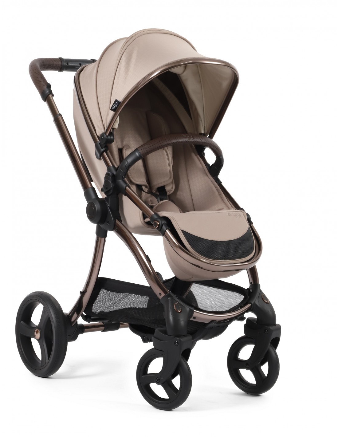 Includes; chassis, seat unit, raincover, insect net, apron, fleece liner, shopping basket, extendable canopy, carrycot with mattress, carrycot raincover, changing rucksack, footmuff, car seat adaptor, matching Egg Shell iSize car seat & Egg Shell IsoFix base.
