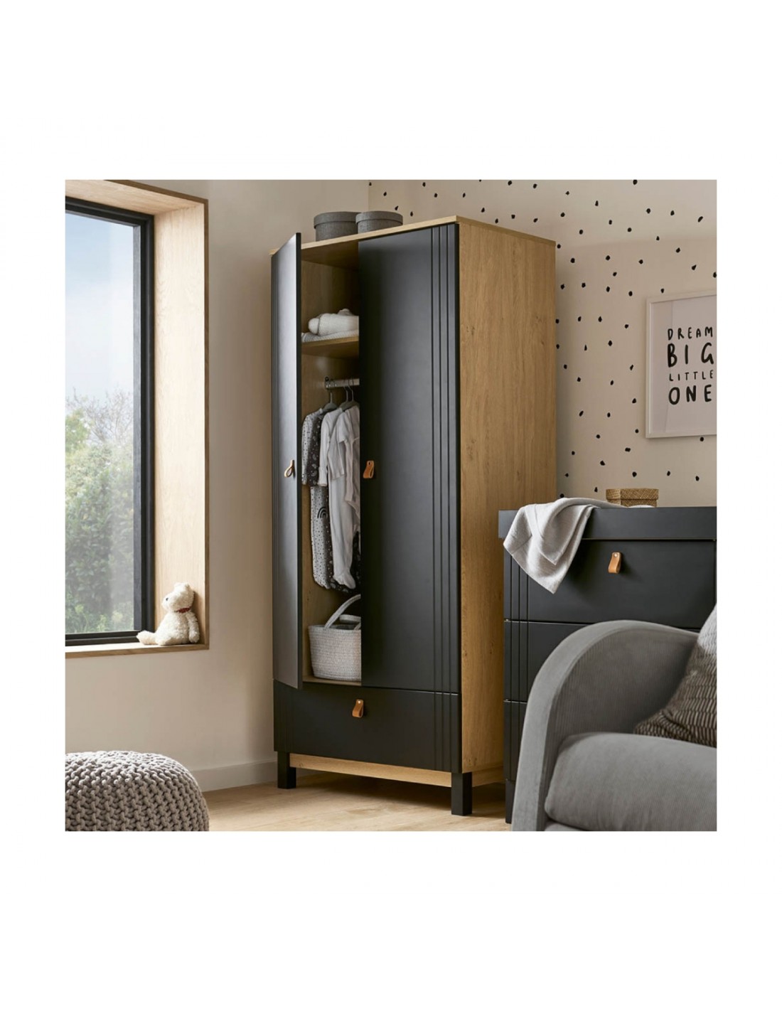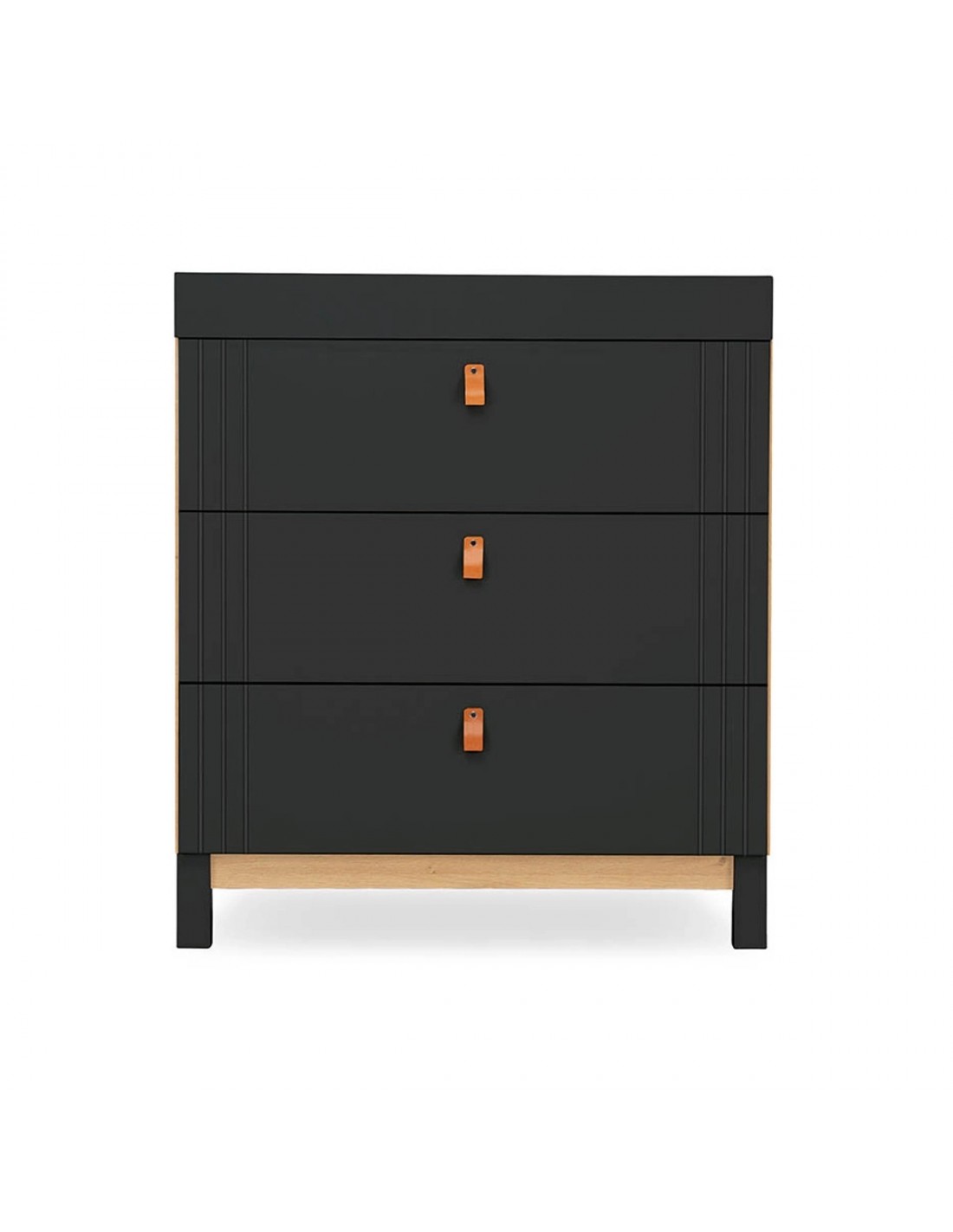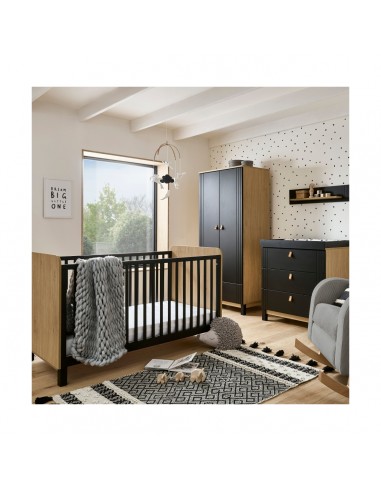 The Rafi 3 Piece Nursery Furniture Set is guaranteed to make a stylish statement with its bold, minimalist design. This modern nursery set features a two-tone colourway, pairing smooth black, painted finish with natural oak tones. Subtle linear detailing and soft leather handles add to Rafi’s stand-out style.