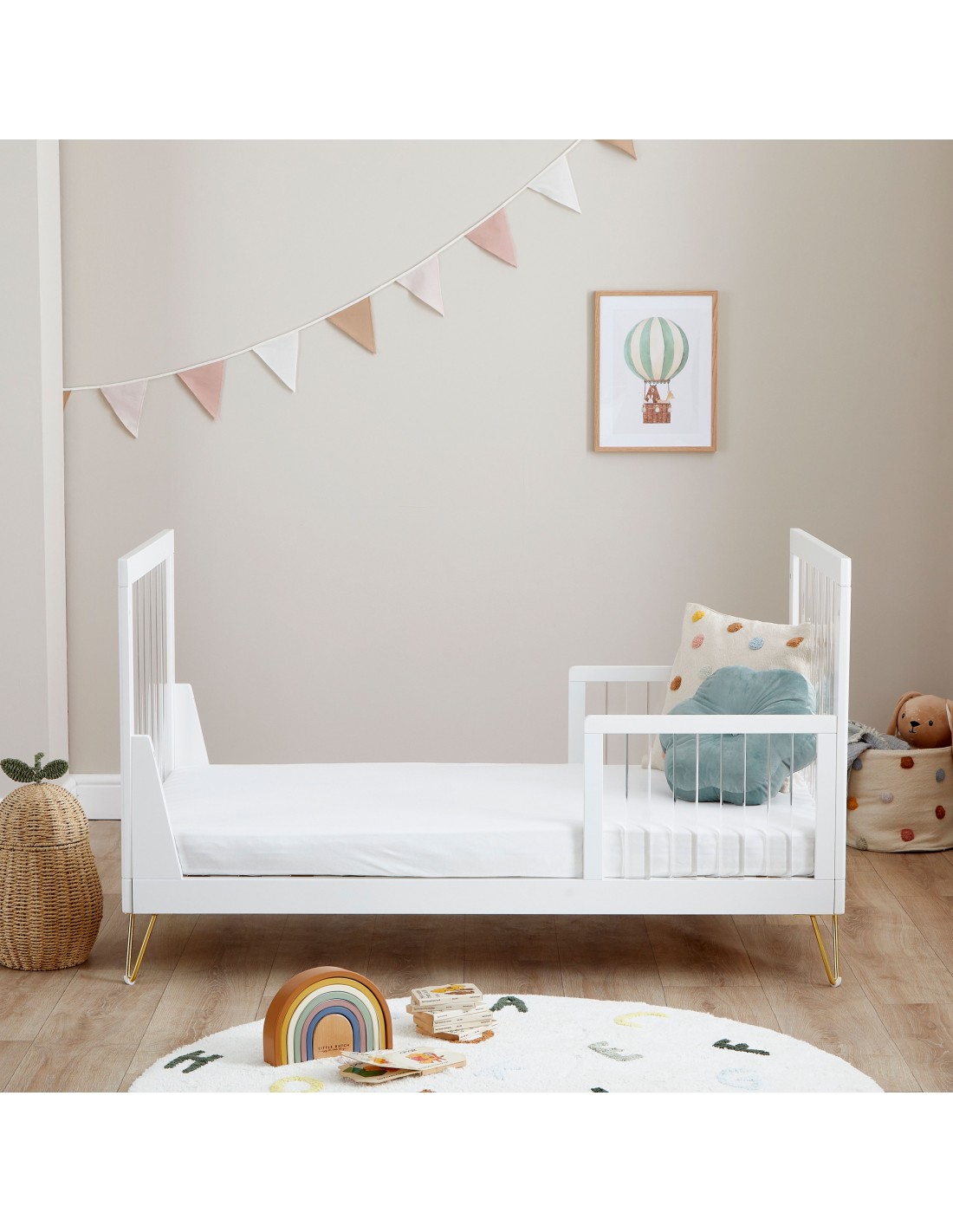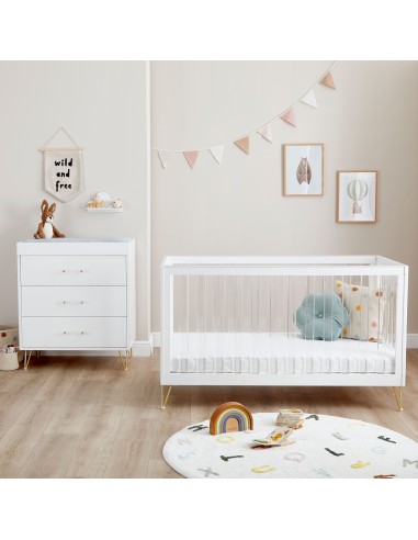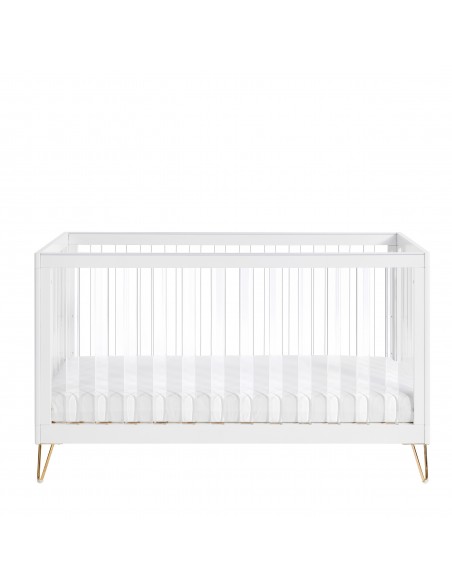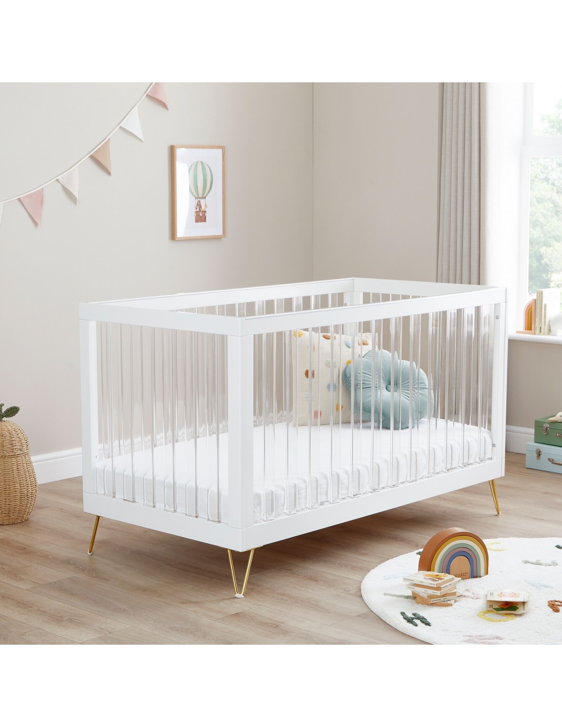 The Scandi-inspired cot bed has been stylishly designed with acrylic slats and retro hairpin legs. It offers 3 adjustable mattress heights, teething rails, and can be transformed into a toddler or day bed, suitable from birth to 5 years old. Two toddler rails, also boasting an acrylic style, are included for added peace of mind once your little one has grown and is old enough to sleep without the full cot rails.
