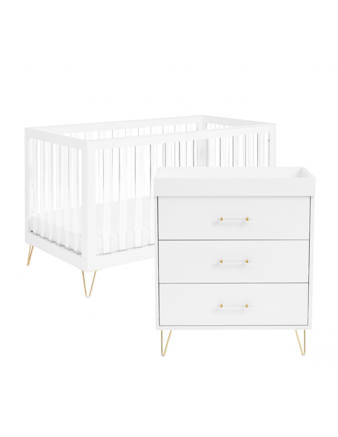 An exquisite combination of contemporary style, modern acrylic, and retro hairpin legs all blend seamlessly to provide a striking fashion statement in this Kimi Acrylic 2-piece nursery room set.