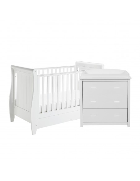 Introducing the 2-piece Stella nursery room set, which includes a stylish sleigh cot bed and a convenient chest changer, perfect for your little one’s bedroom.