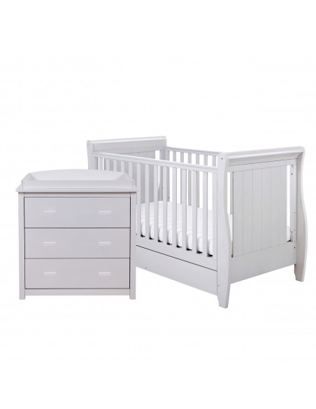 Introducing the 2-piece Stella nursery room set, which includes a stylish sleigh cot bed and a convenient chest changer, perfect for your little one’s bedroom.