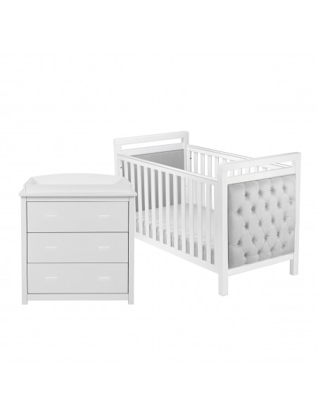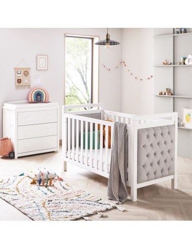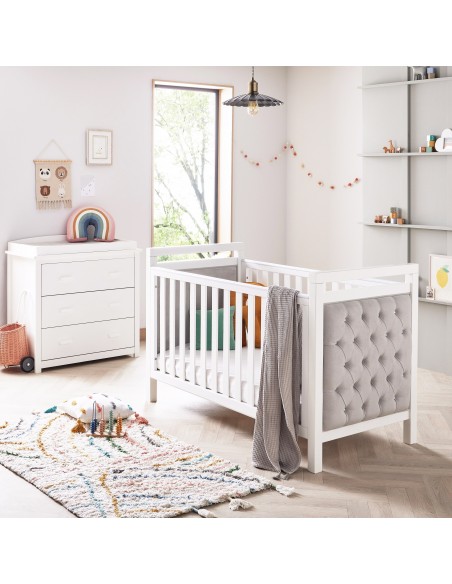 Crafted from the highest quality materials, this furniture set is designed to last for years to come. The centrepiece of the set is the luxurious velvet cot bed with diamante button detailing. The cot bed is expertly upholstered in velvet fabric, giving it a look and feel that is truly one-of-a-kind. The mattress has 3 positions which get lower as your baby gets older and more mobile. Once they outgrow the cot it an easily be transformed into a stylish toddler bed
