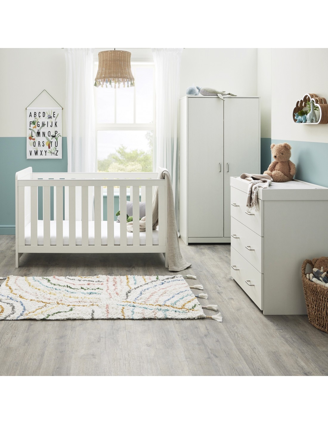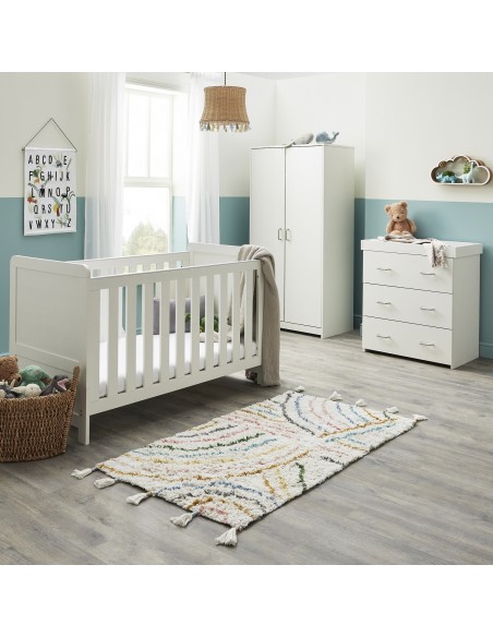 The Caro nursery collection is the ideal starting point for your nursery decor thanks to its timeless style and woodgrain finish. A stylish cot bed, versatile dresser, and double wardrobe are included in the Caro 3-piece nursery set.