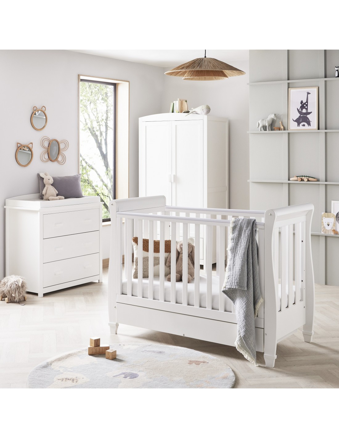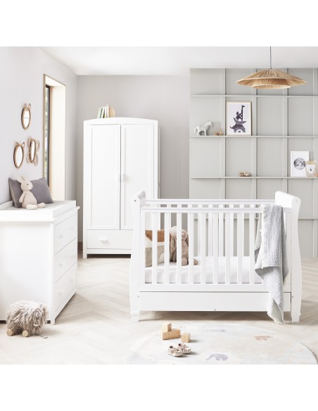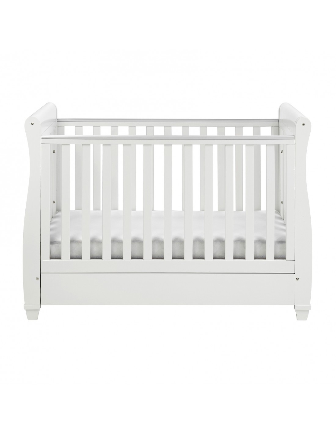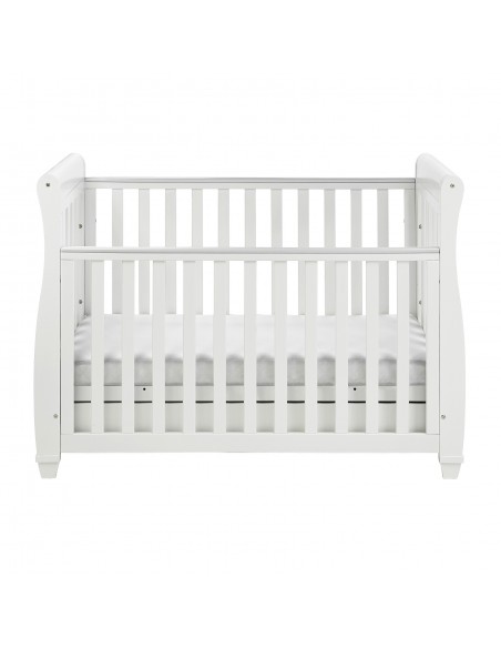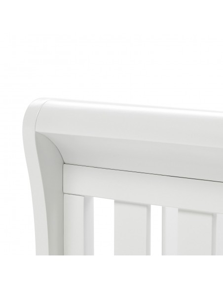 The sleek and stylish sleigh cot bed will transport you and your baby to a world of cosy dreams and peaceful slumber. With its smooth curves and elegant design, this cot bed is more than just a place to sleep; it’s a sanctuary for your little one. Crafted from high-quality materials, this cot bed is built to last and ensure your baby’s safety and comfort for years to come. With three mattress positions, a functional drop-side plus the ability to transform into a toddler bed, this piece of furniture will last you until your little one is ready to move into a full size single bed.