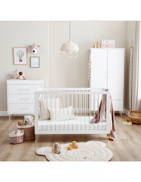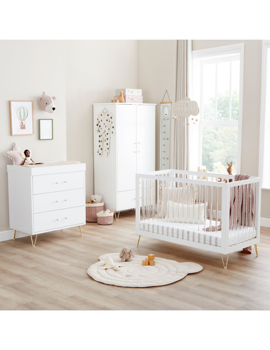 But that’s not all! This stunning room set also includes the Kimi Kimi Acrylic Wardrobe providing even more space to hang and store your precious bundle’s clothing and accessories. The beautiful soft-close double doors open up to reveal two hanging rails providing a safe and secure place to keep your baby’s adorable outfits. As your little one grows, you can remove the lower hanging rail. The full-width drawer glides open and shut with effortless ease and offers even more storage space for nappies, blankets, sleeping bags, clothes or shoes.