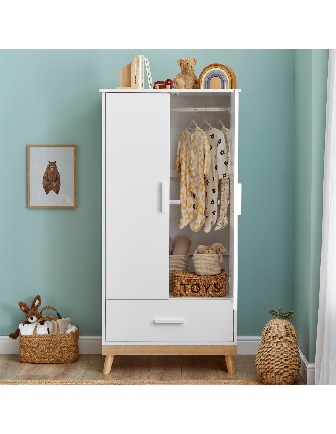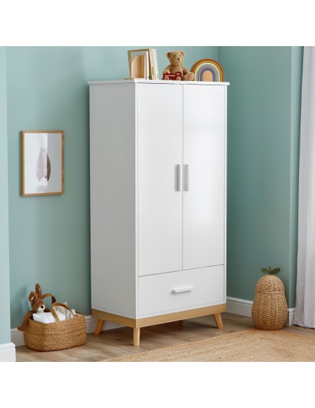 The accompanying wardrobe provides additional storage space, with a full-length hanging rail and a spacious drawer at the bottom for extra storage.