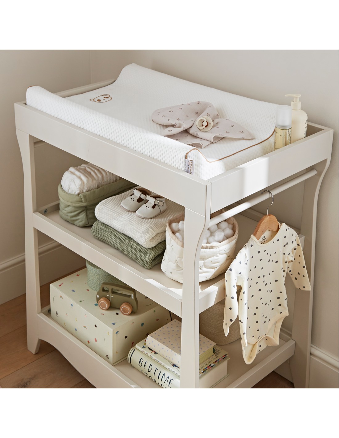 - The two towel rails at either end of the changer are perfect for hanging baby's outfit for the day