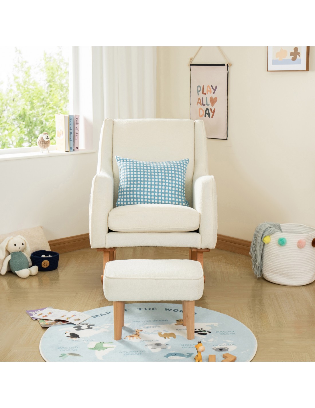 Two handy storage pockets for all your baby’s essentials mean you don’t have to get up and disturb baby whilst they settle. Matching footstool included for added comfort for those tired legs. Available in three soft neutral colours – Ivory, Cashmere and Bouclé – perfectly complementing not only your nursery but any room setting for years to come.