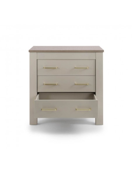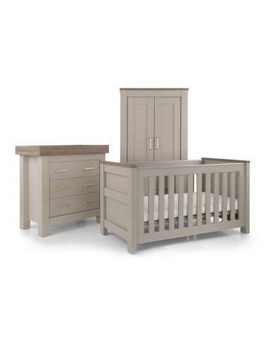 Part of the sophisticated Charnwood collection by BabyStyle, this 3‑Piece Oatmeal set exudes understated luxury with its soft oatmeal hue, matte aluminium handles, and clean-lined design. The cot bed features a 3‑position adjustable base, protective teething rails, and seamless conversion into a junior bed—offering long-term use. The dresser includes a removable changer lid with discreet fixings and three smooth‑glide drawers for essential storage. The wardrobe features soft‑close doors, an integrated drawer, a hanging rail, and a shelf for flexible organisation. Built to prioritize both aesthetics and durability, this set delivers lasting style and function.