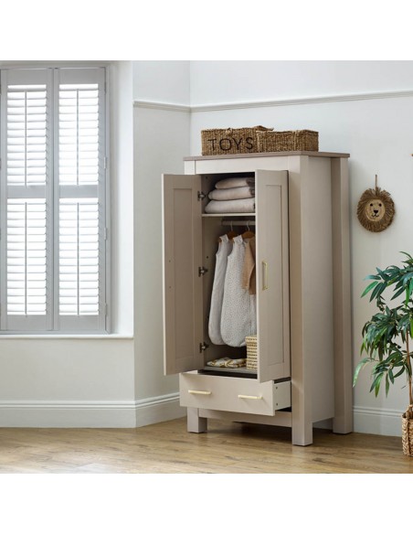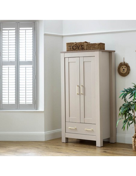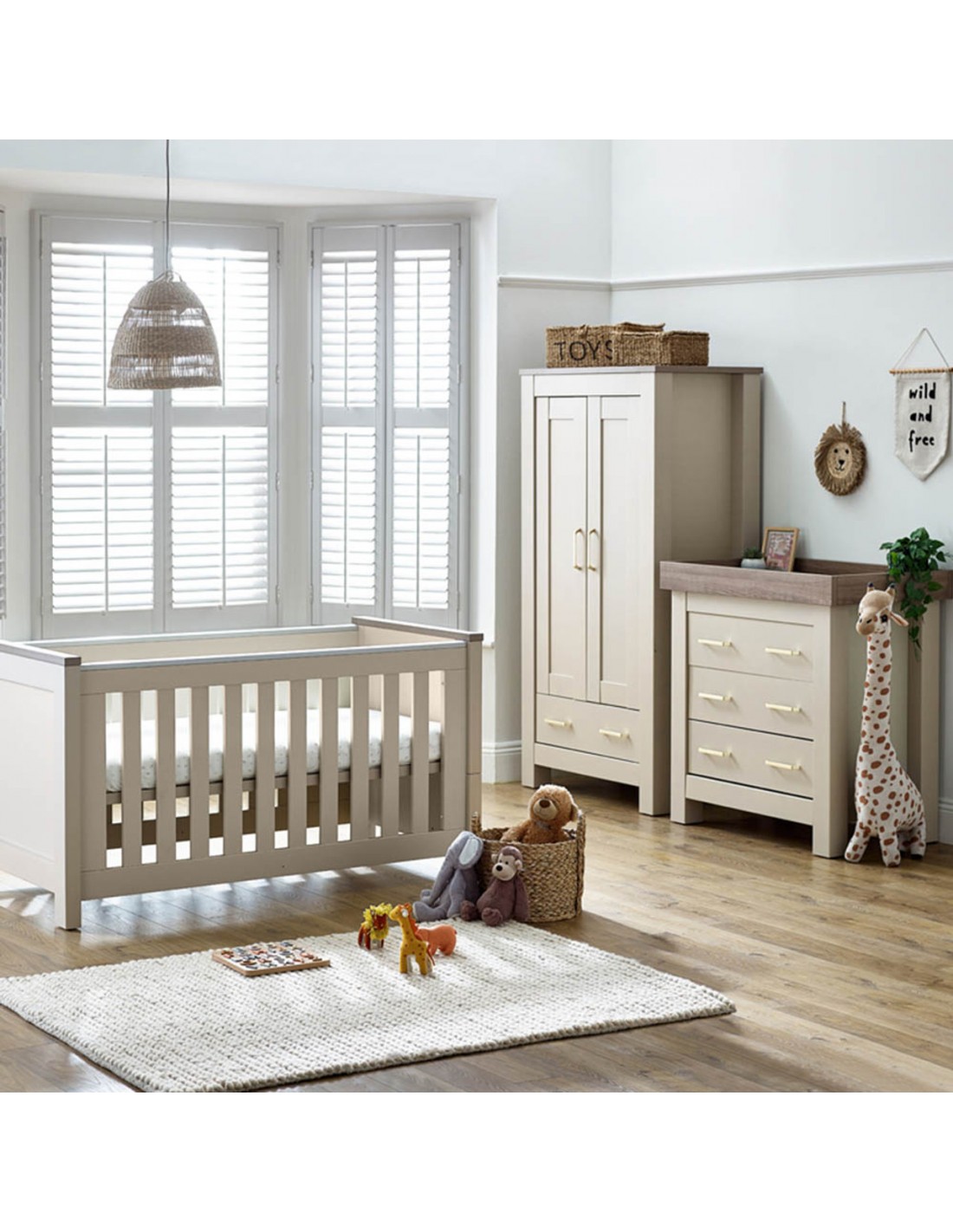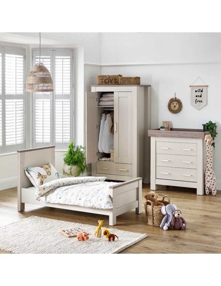 The BabyStyle Bordeaux Oatmeal 3‑Piece Set combines timeless elegance with nursery practicality. Crafted in a warm oatmeal finish with subtle wood-effect detailing and refined hardware, the set includes a cot bed, dresser with detachable changing top, and a spacious wardrobe—designed to adapt with your child, from newborn through toddler years.