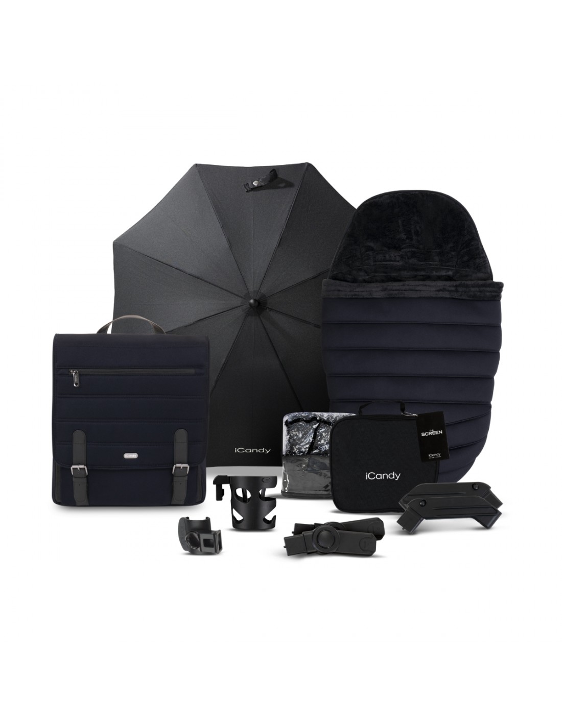 Peach chassis, carrycot fabric, seat unit fabric, carrycot/seat unit frame, canopy, mattress liner, basket, raincover, elevators, car seat adaptors, bumper bar, peach bag, footmuff, the screen, peach clamp, cup holder, parasol, iCandy Cocoon car seat & IsoFix base.