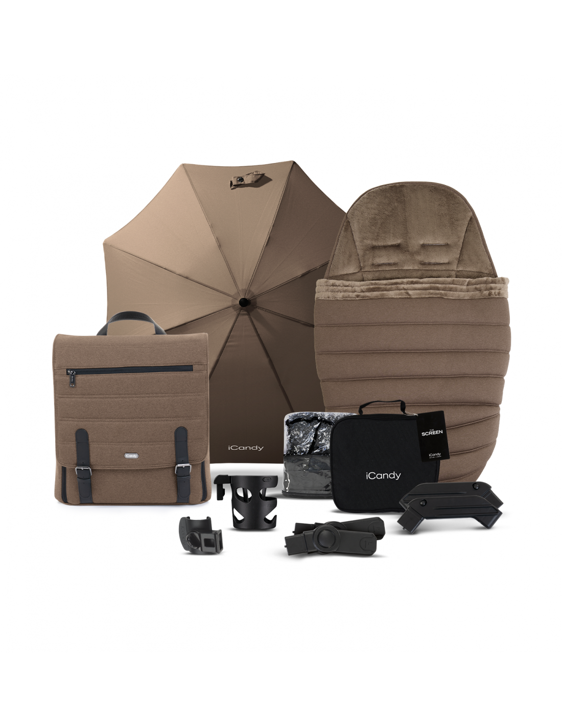 Peach chassis, carrycot fabric, seat unit fabric, carrycot/seat unit frame, canopy, mattress liner, basket, raincover, elevators, car seat adaptors, bumper bar, peach bag, footmuff, the screen, peach clamp, cup holder, parasol, iCandy Cocoon car seat & IsoFix base.