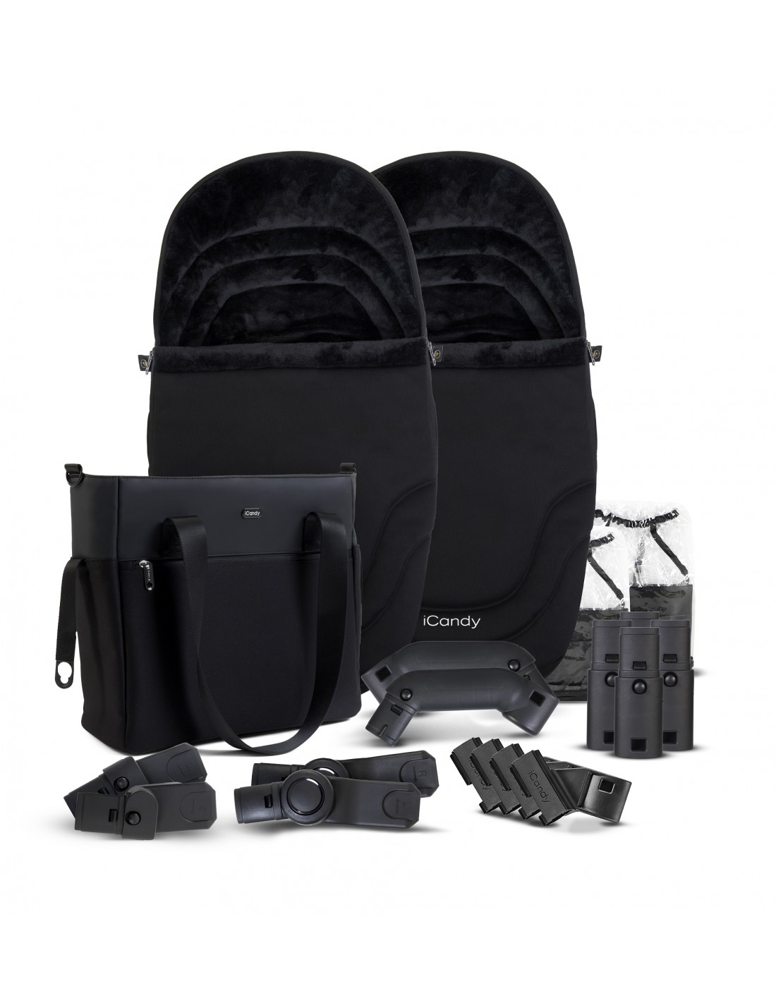 Chassis, Carrycot/Seat Unit Frame x2, Carrycot Fabric x2, Seat Unit Fabric x2, Carrycot Mattress x2, Carrycot Baseboard x2, Canopy x2, Bumper Bar x2, Upper/Main Car Seat Adaptors, Lower Car Seat Adaptors, Elevator Adaptors, Risers, Converter Adaptors, Footmuff & Liner x2, Changing Bag, Raincover x2.