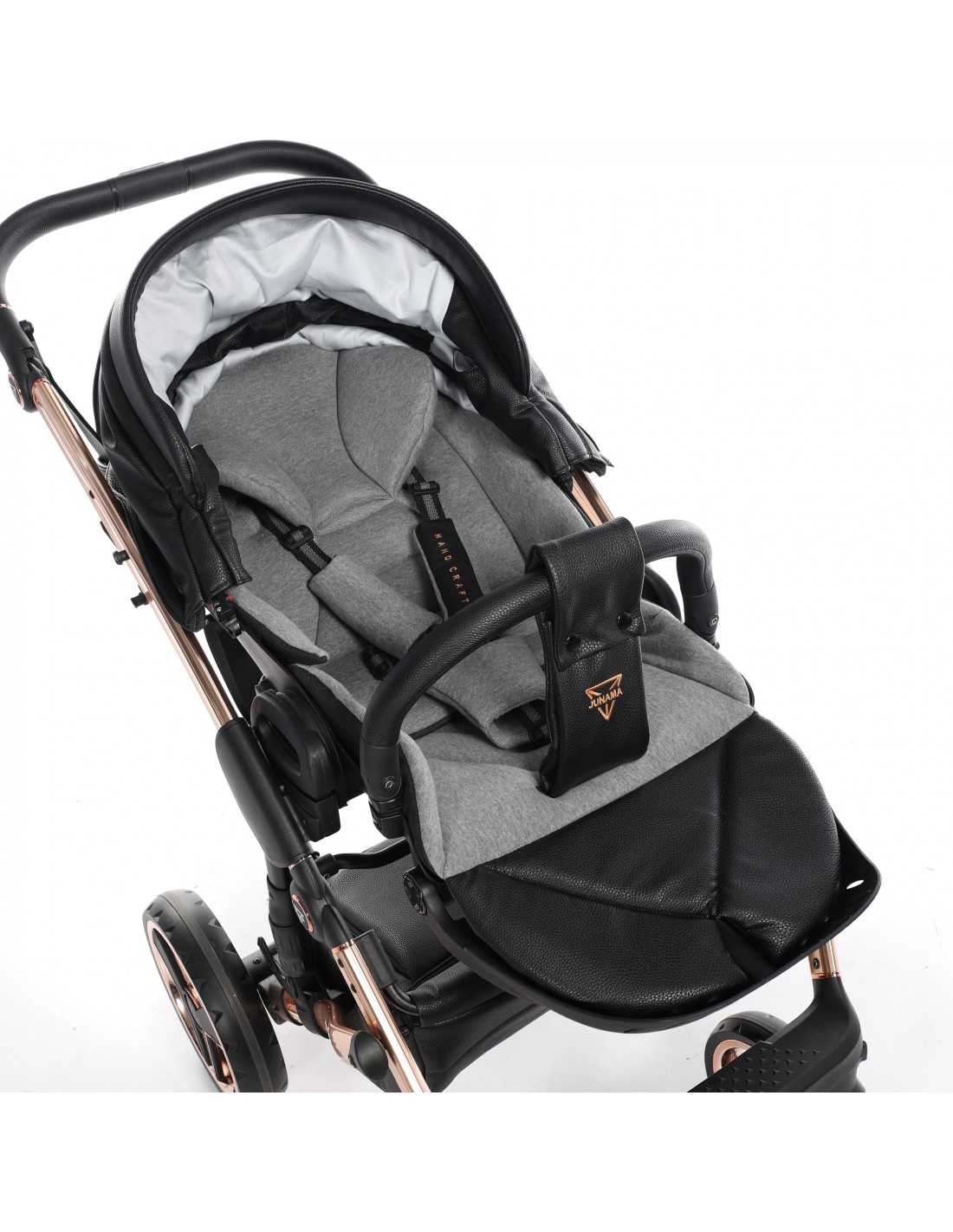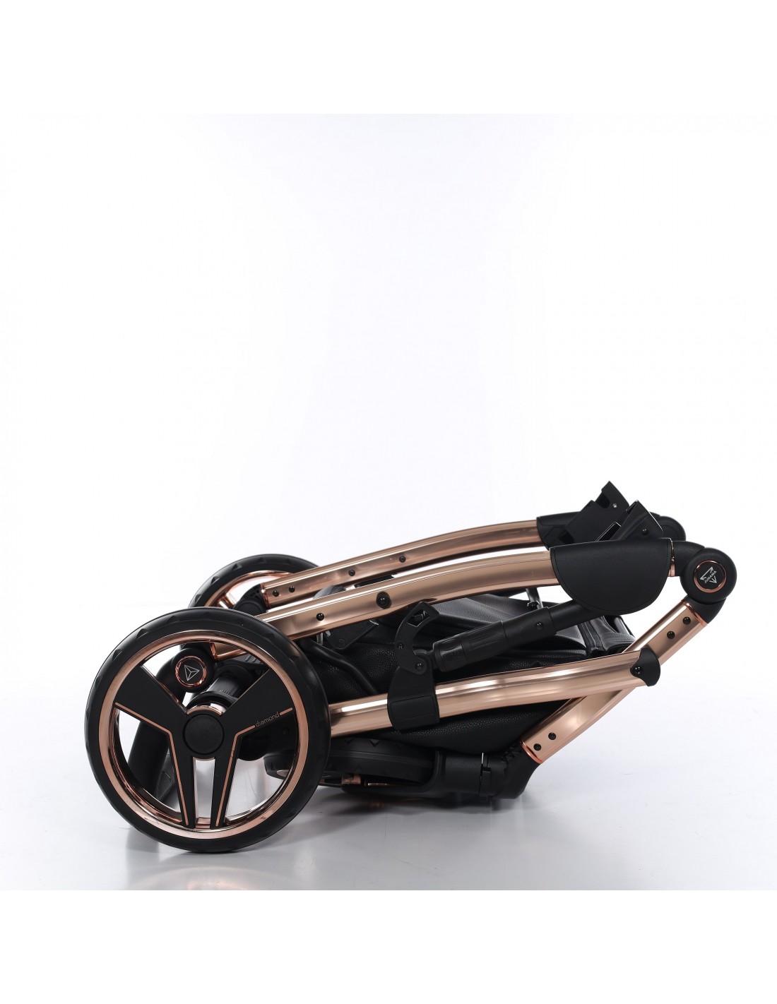 The height adjustable handle bar can be adjusted 180° to suit all members of the family and has an eco-leather finish for utmost comfort. The ingenious folding mechanism allows for a compact collapse, the chassis can fold together with the pushchair seat unit attached protecting the upholstery and ensuring hygiene.