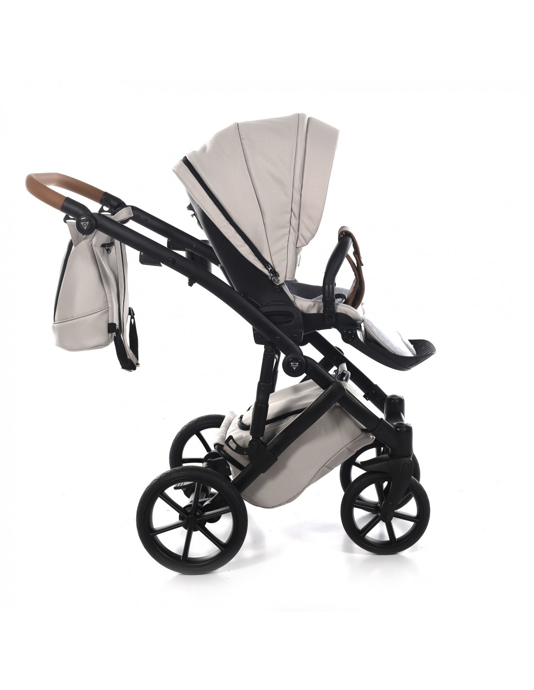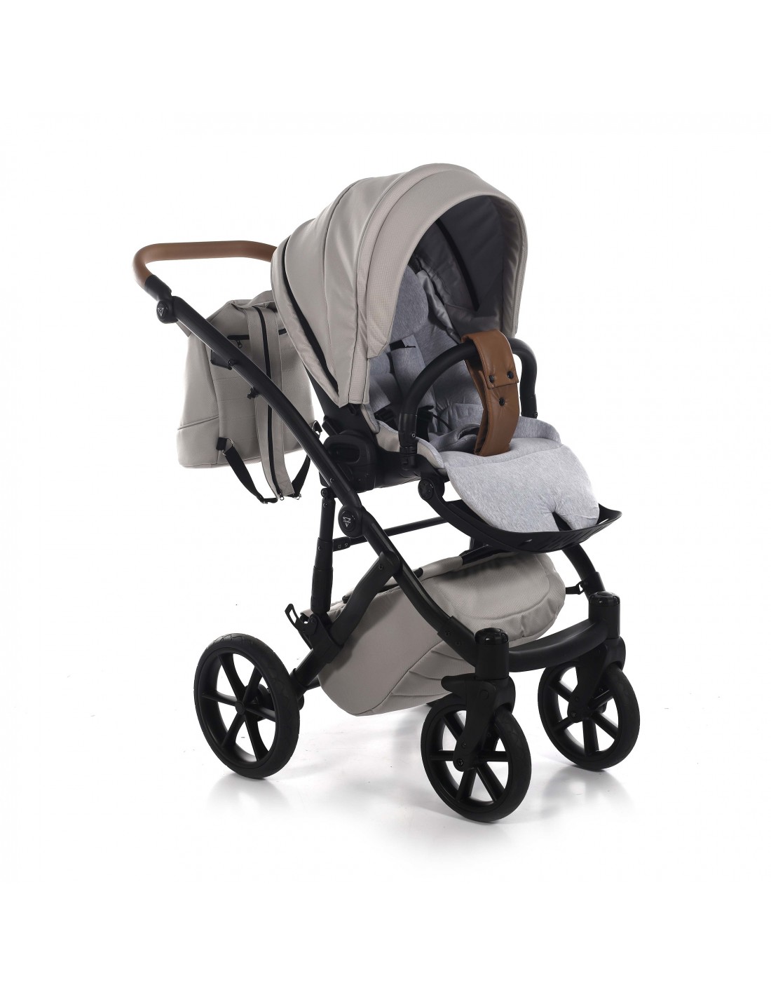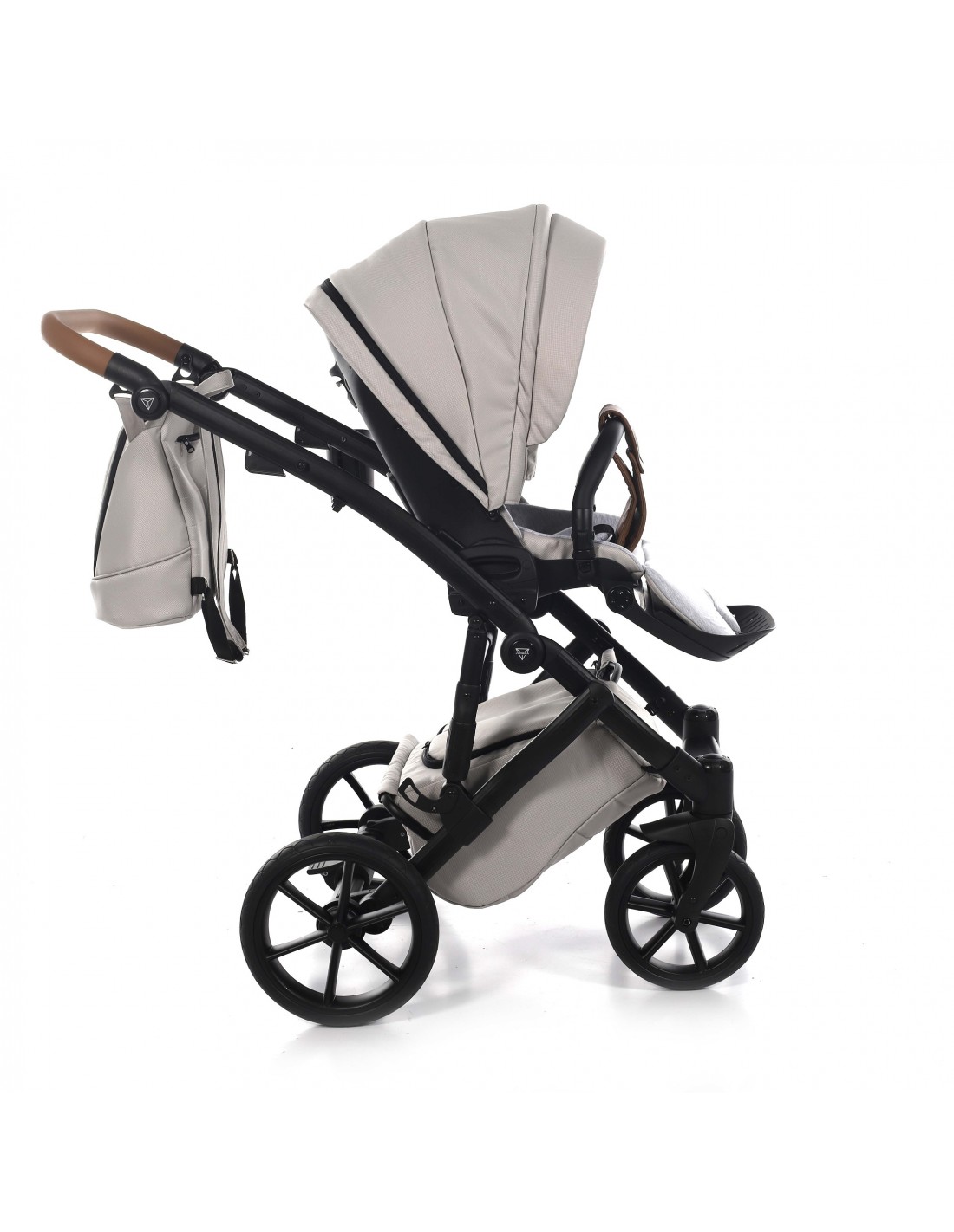 The height adjustable handle bar can be adjusted 180° to suit all members of the family and has an eco-leather finish for utmost comfort. The ingenious folding mechanism allows for a compact collapse, the chassis can fold together with the pushchair seat unit attached protecting the upholstery and ensuring hygiene.