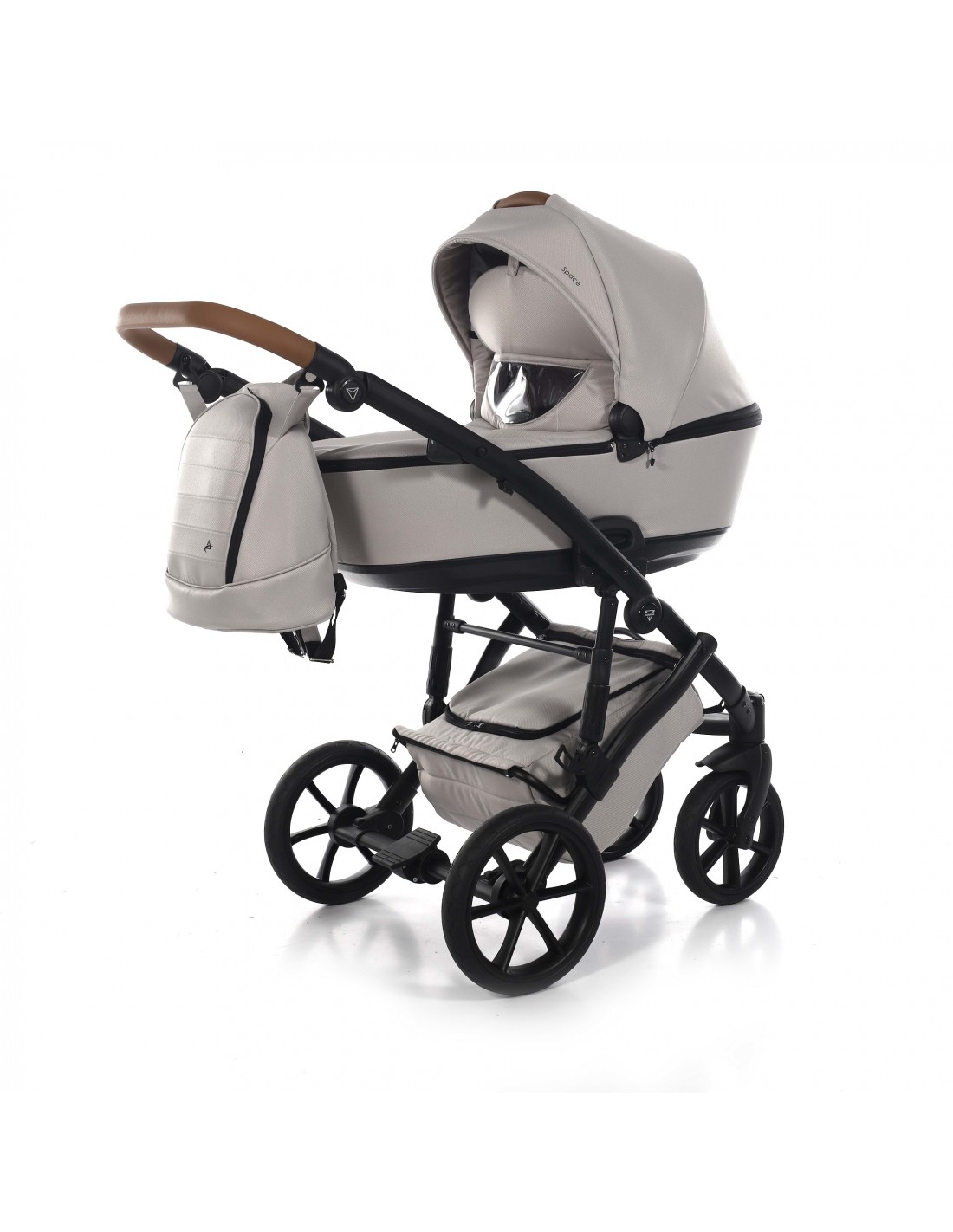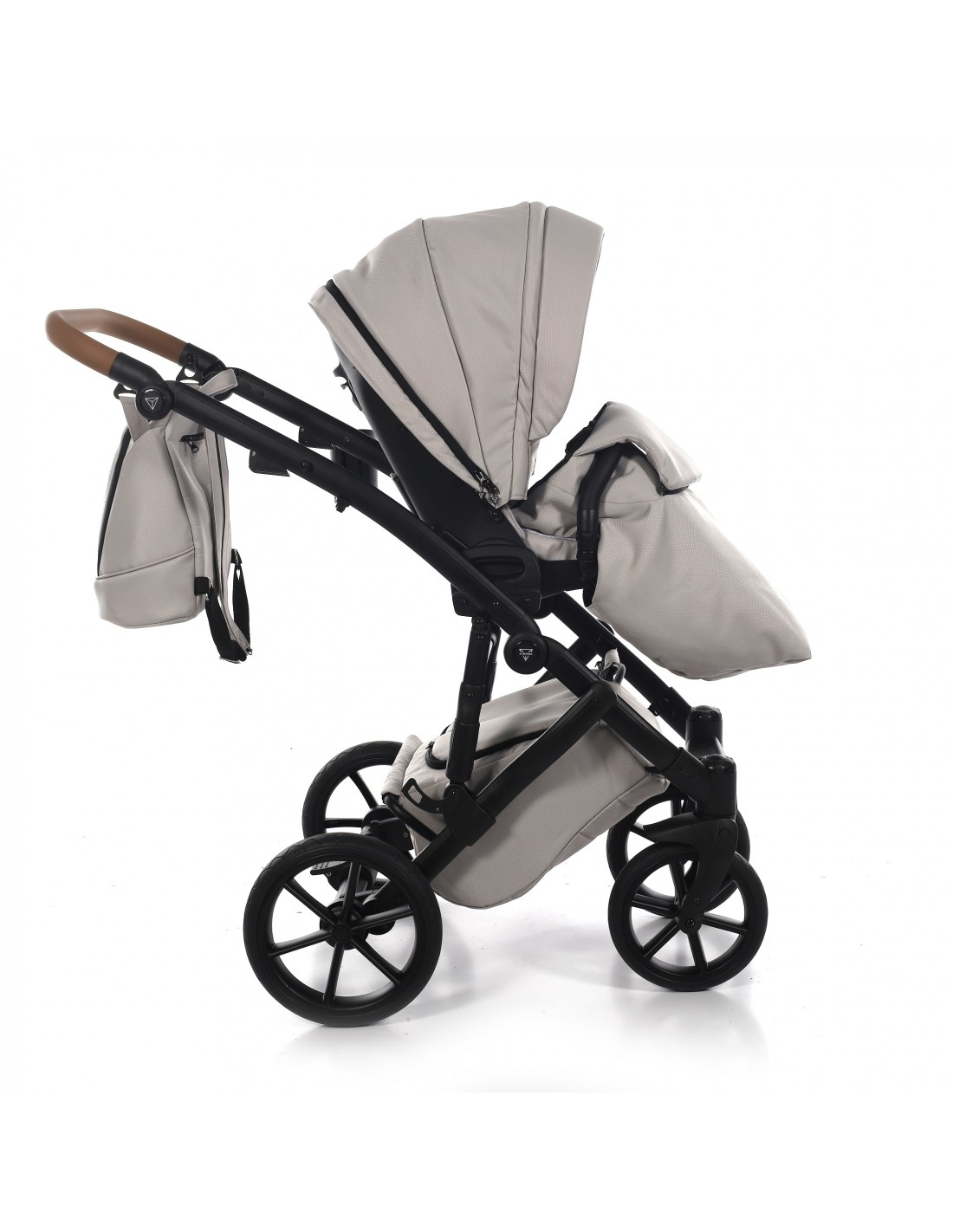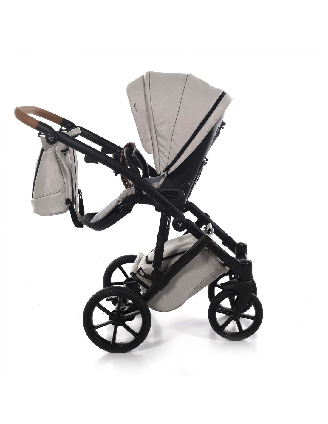 The height adjustable handle bar can be adjusted 180° to suit all members of the family and has an eco-leather finish for utmost comfort. The ingenious folding mechanism allows for a compact collapse, the chassis can fold together with the pushchair seat unit attached protecting the upholstery and ensuring hygiene.