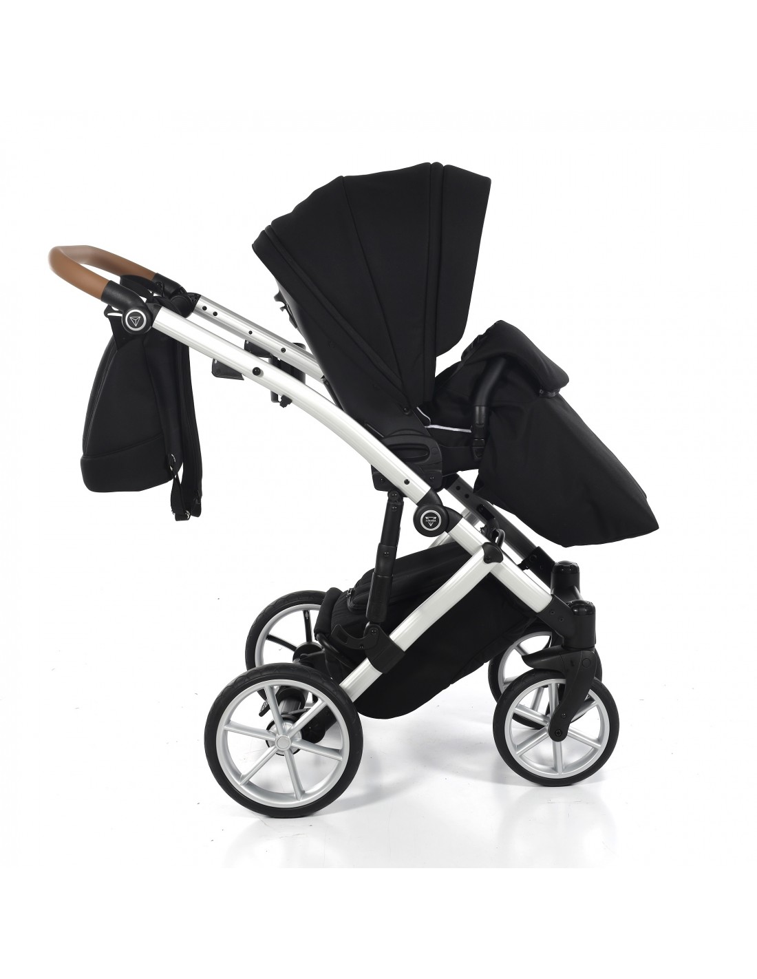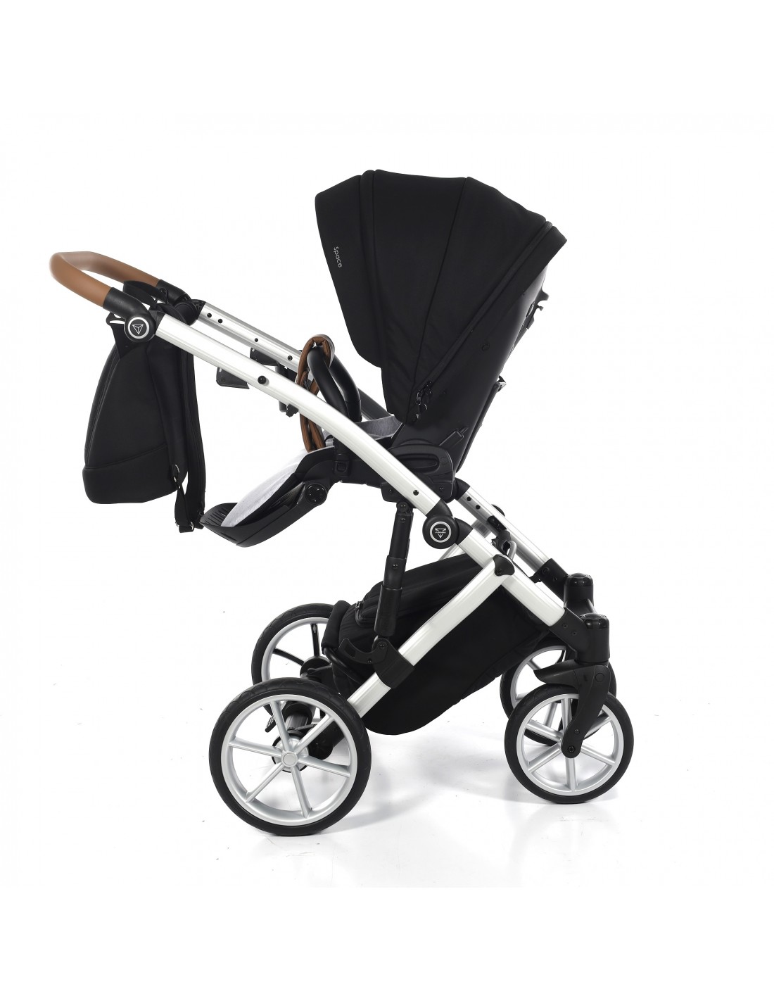 The height adjustable handle bar can be adjusted 180° to suit all members of the family and has an eco-leather finish for utmost comfort. The ingenious folding mechanism allows for a compact collapse, the chassis can fold together with the pushchair seat unit attached protecting the upholstery and ensuring hygiene.