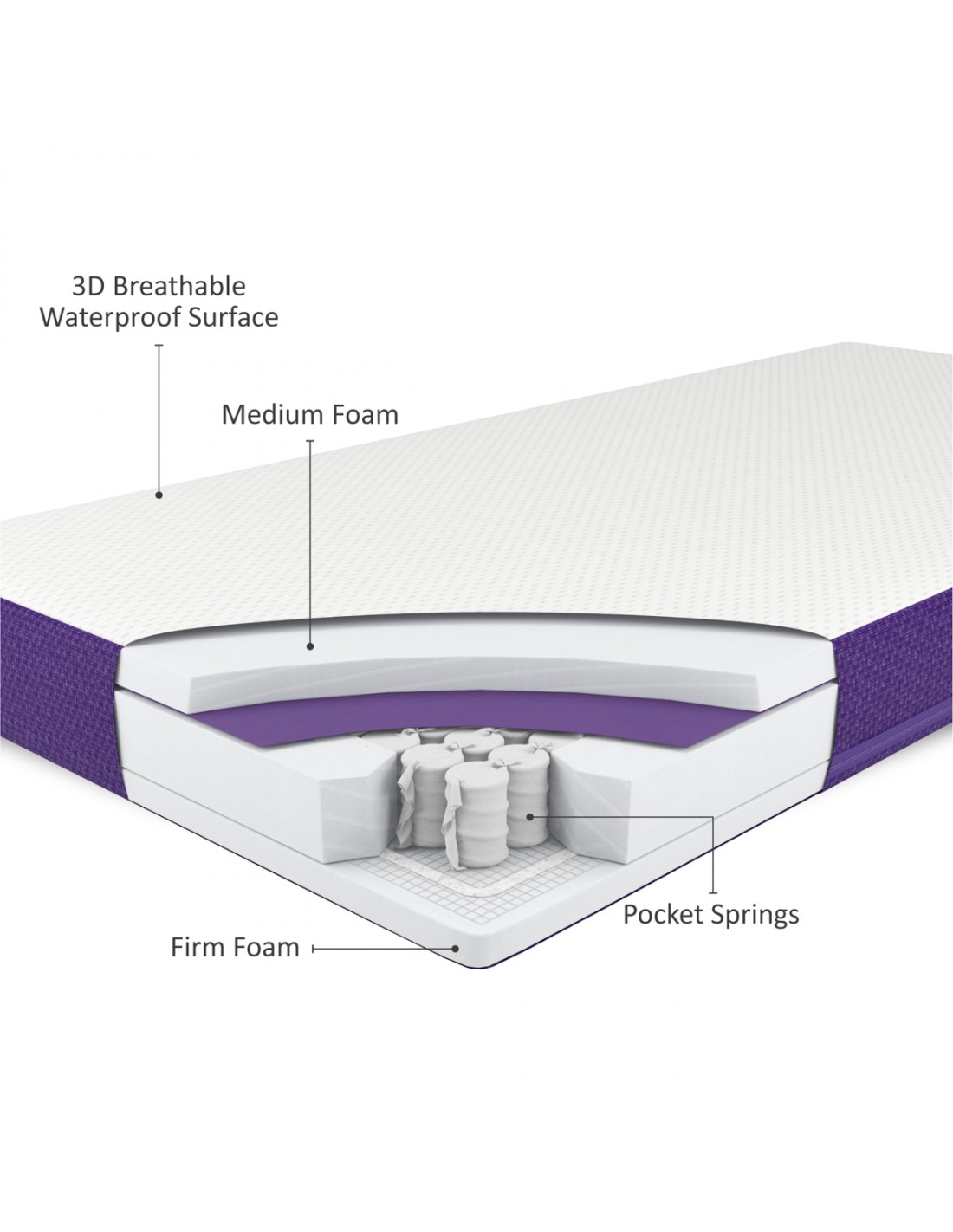 The SnuzSurface Duo cot and cot bed mattress boasts an innovative 3D breathable mesh cover with a waterproof membrane, ideal for those potty training years. The Duo mattress features a sophisticated pocket sprung core, tailored to provide progressive support for baby as they grow and develop into toddlerhood.