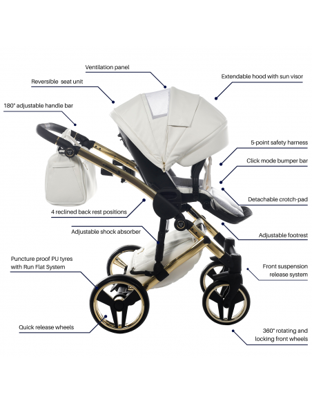 The aluminium chassis comes with superb suspension, large shopping basket and quick release wheels. Engineered with 6 shock breakers which make the pram extra comfortable and smooth. The reliable front suspension release system absorbs shocks from the ground and frontal blows, for example when hitting the curb. The chassis is engineered with a separate adjustable shock absorber ensuring agile steering on all terrains.
