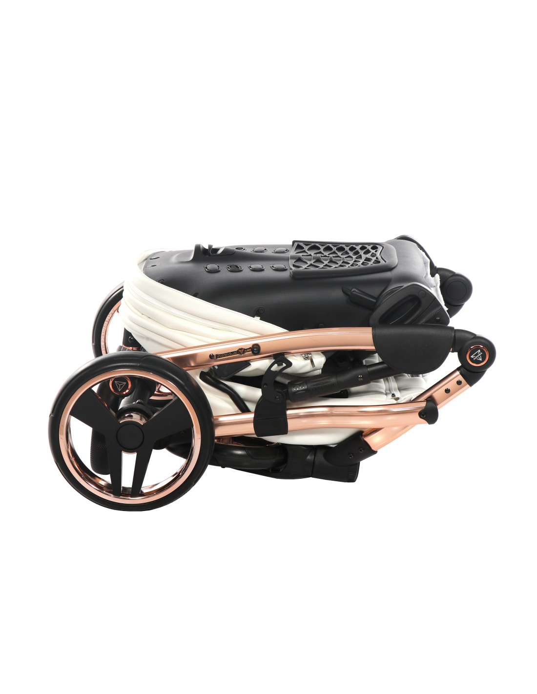 The height adjustable handle bar can be adjusted 180° to suit all members of the family and has an eco-leather finish for utmost comfort. The ingenious folding mechanism allows for a compact collapse, the chassis can fold together with the pushchair seat unit attached protecting the upholstery and ensuring hygiene.