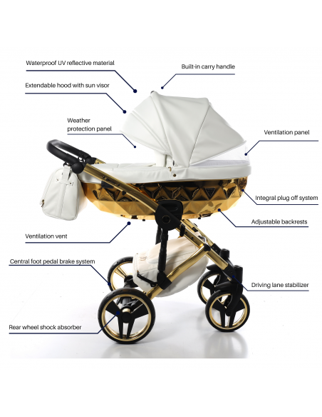 Junama has designed and manufactured exclusive prams in Europe for over 30 years. The Junama pram offers a completely new look in the world of prams. Inspired by the jewel that evokes the greatest emotion, the diamond, Junama designed the rare and beautiful diamond carrycot.