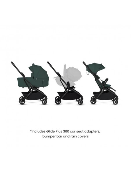 Includes; pushchair (complete with hood and seat liner), carrycot (complete with mattress), bumper bar, raincover and Glide Plus car seat adaptors.