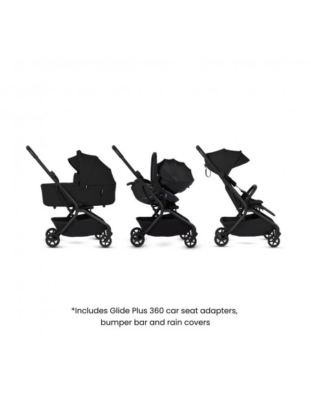 Includes; pushchair (complete with hood and seat liner), carrycot (complete with mattress), Glide Plus 360 car seat, Base Plus 360 IsoFix, bumper bar, x2 raincovers, changing rucksack, footmuff, organiser bag, cup holder and Glide Plus car seat adaptors.