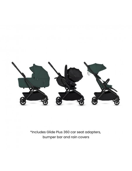 Includes; pushchair (complete with hood and seat liner), carrycot (complete with mattress), Glide Plus 360 car seat, Base Plus 360 IsoFix, bumper bar, x2 raincovers, changing rucksack, footmuff, organiser bag, cup holder and Glide Plus car seat adaptors.