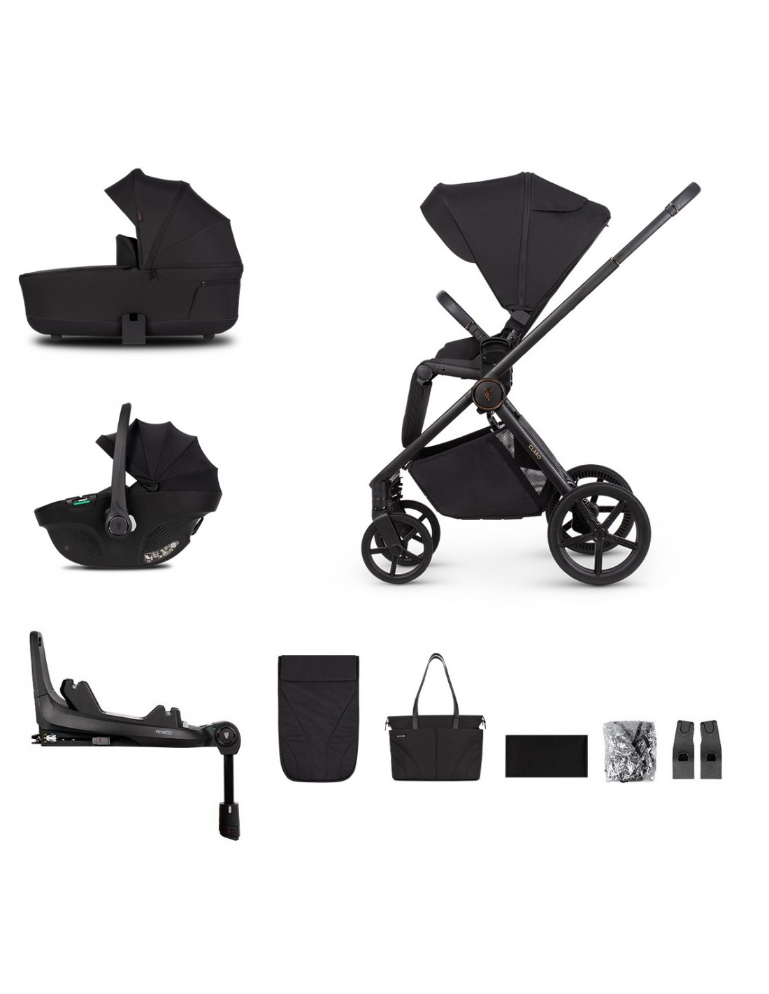 Package includes: chassis, seat unit, carrycot, changing bag, footmuff, raincover, changing mat, Tiago car seat, Tiago 360 IsoFix base & car seat adaptors.