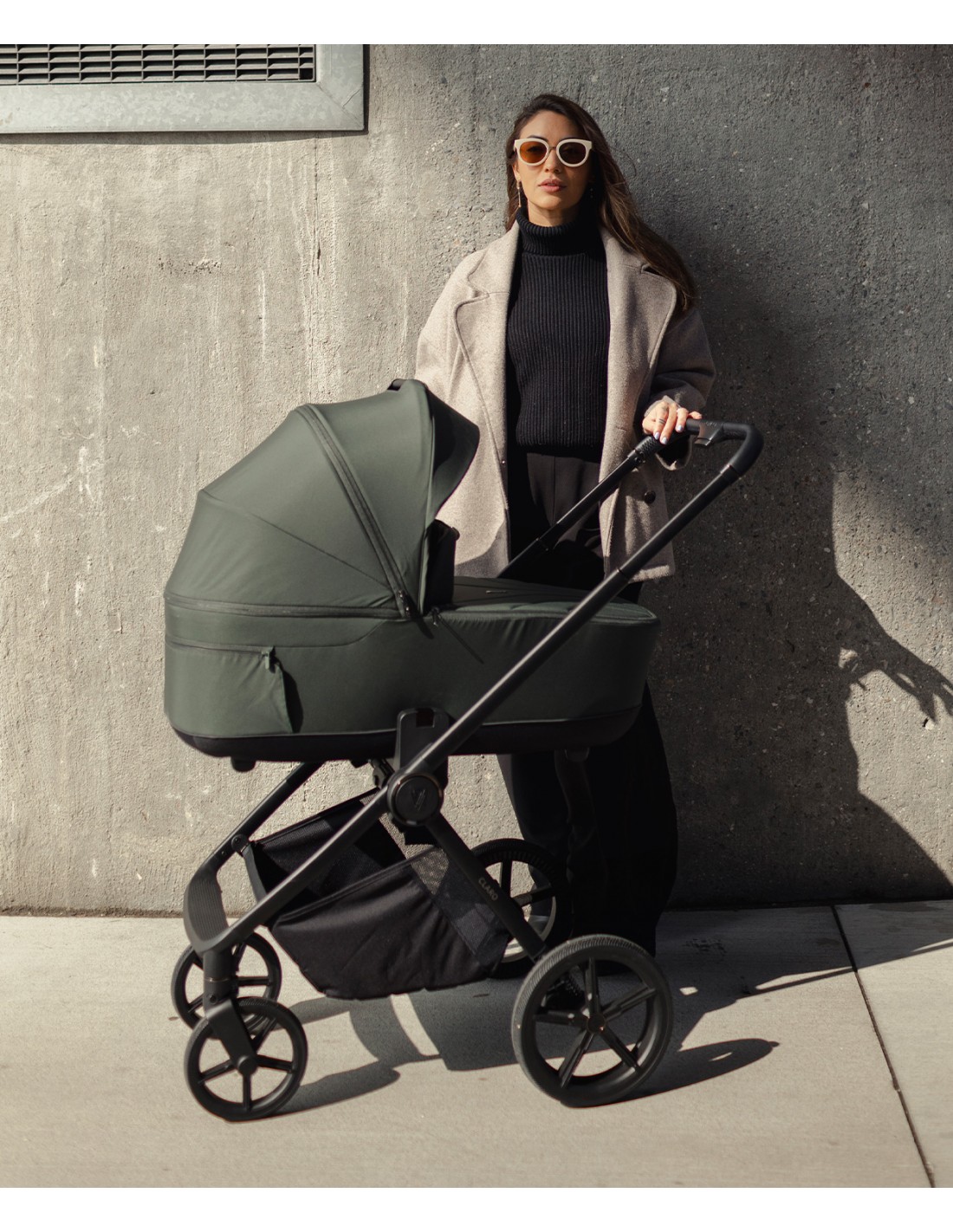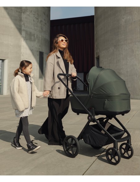 One move — that's all it takes to fold the pram frame effortlessly and carry it with ease, without feeling burdened by its weight. We understand that lightness is a feature sought not only by families navigating stairs daily but also by every mum who, as is often the case in the city, juggles multiple tasks simultaneously. With Claro, you can do so stress-free. You'll fold the pram in seconds, then throw it over your shoulder with the special strap we've added to this model for your convenience. Although the Claro frame is lightweight, its aluminum construction boasts high durability. Yes, this is a pram that will be with your child for years.