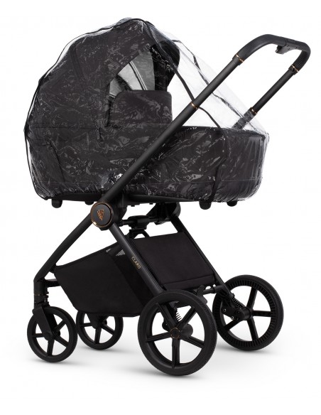 If you're caught in the rain during a walk, you don't have to rush back home to ensure your little one's comfort. Just reach for the Claro rain cover, which you'll find included with the stroller. You can cover the entire pram with it, protecting your child from rain or snow. The proper ventilation ensures unrestricted airflow in the carrycot or seat unit, and the window in the front—with a zipper—allows you to quickly access your little one. For example, to hand them a toy or snacks.