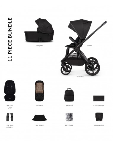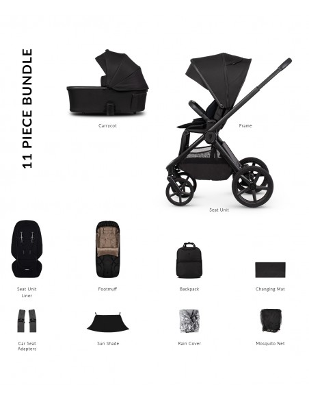 2in1 bundle includes - chassis, seat unit, carrycot, footmuff, mosquito net, raincover, changing backpack, changing mat, car seat adaptors, seat liner & carrycot sunshade.