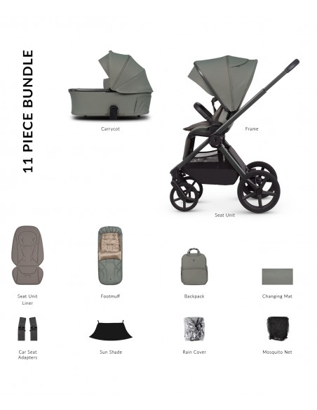 2in1 bundle includes - chassis, seat unit, carrycot, footmuff, mosquito net, raincover, changing backpack, changing mat, car seat adaptors, seat liner & carrycot sunshade.