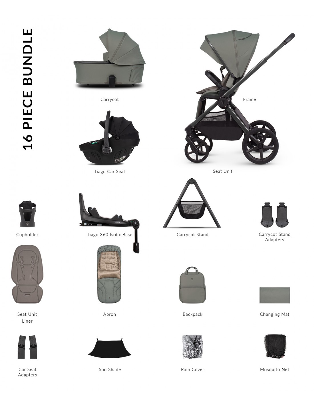 3in1 bundle includes - chassis, seat unit, carrycot, Tiago car seat, Tiago 360 IsoFix Base, Upline3 carrycot stand, carrycot stand adaptors, cup holder, footmuff, mosquito net, raincover, changing backpack, changing mat, car seat adaptors, seat liner & carrycot sunshade.